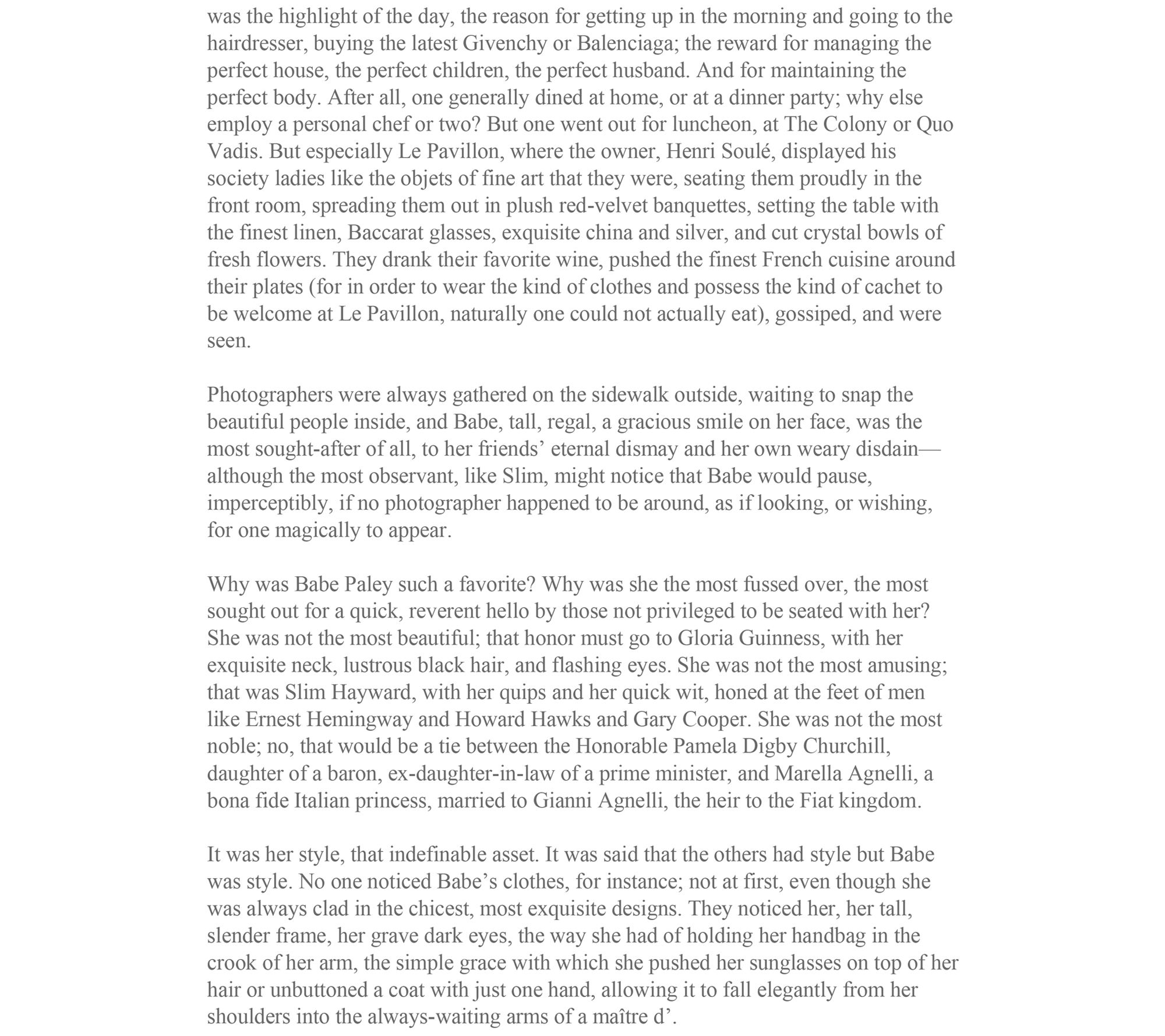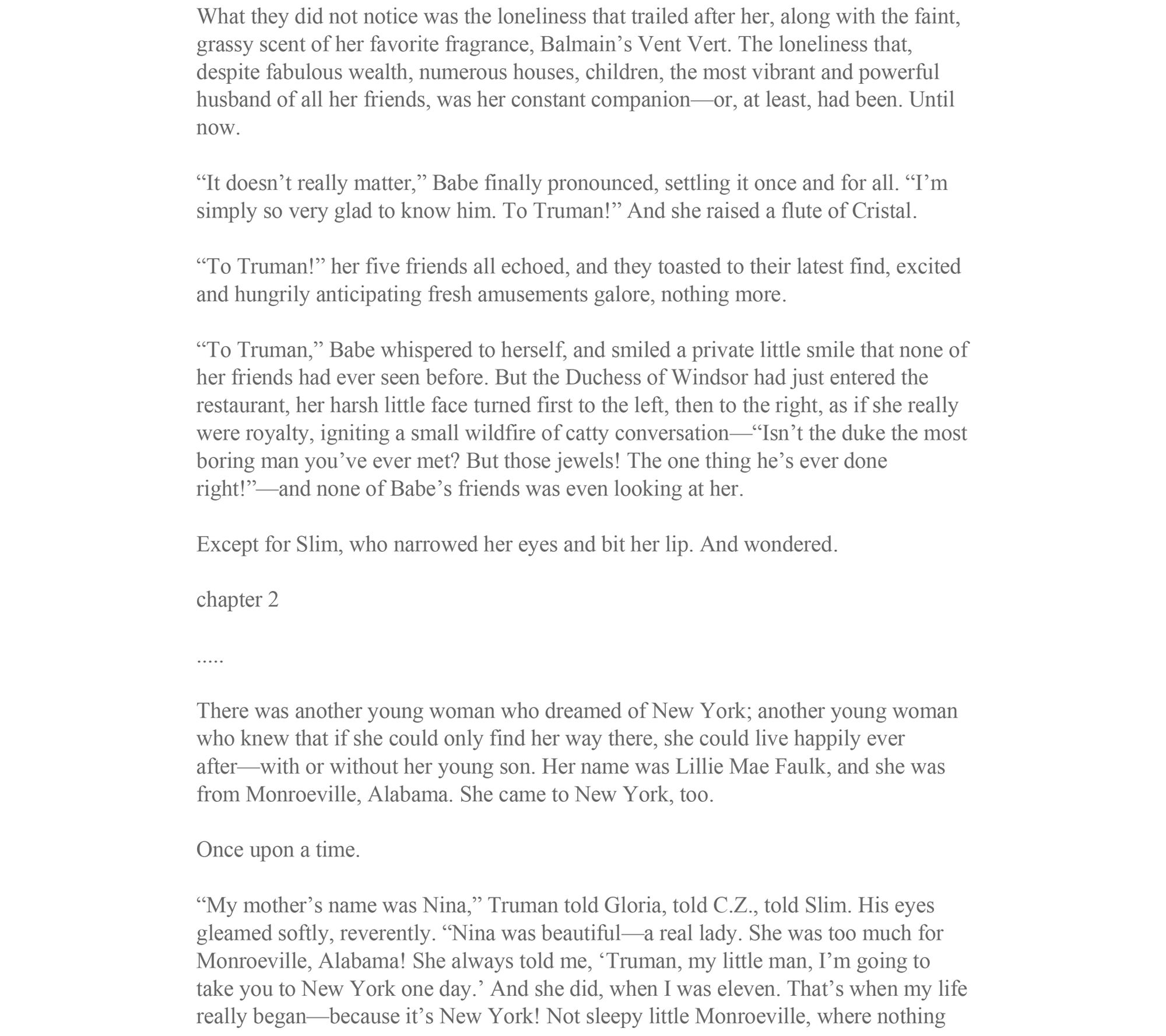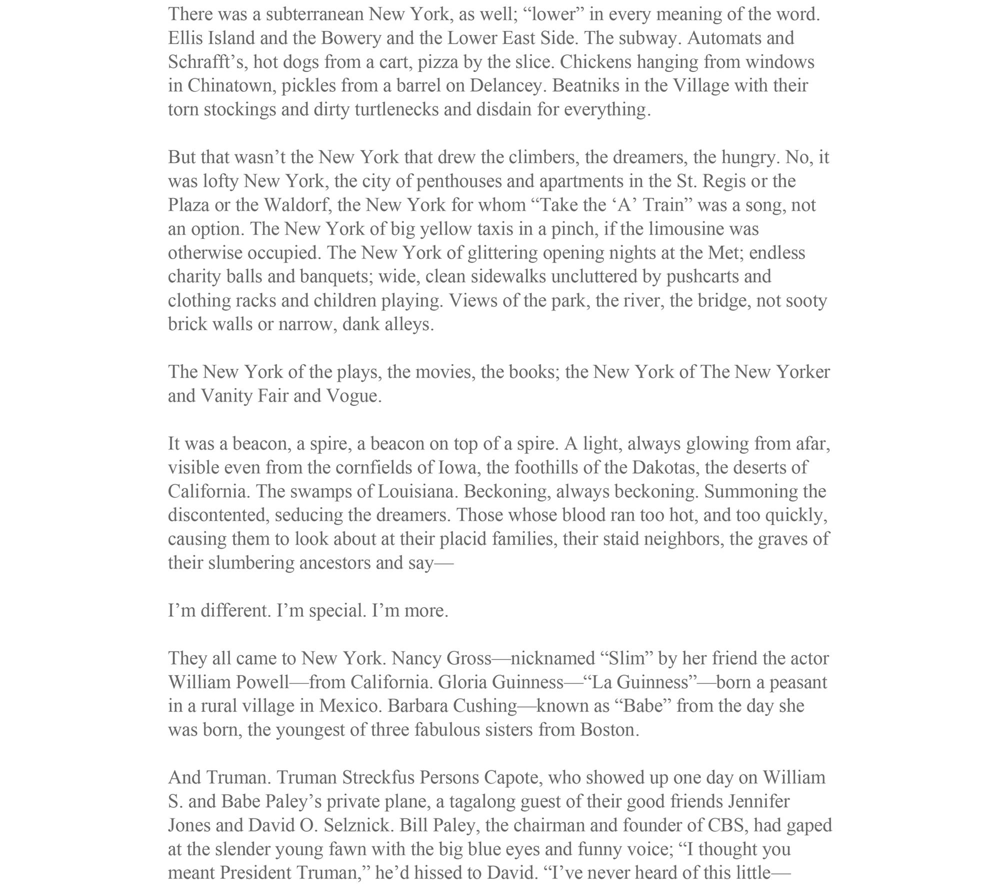 The intriguing story of the 1950s New York's "Swans" and the scandalous, enthralling friendship between Truman Capote and socialite Babe Paley. By all appearances, Babe has it all, but under her composed exterior dwells a passionate woman longing for true love. Enter Truman Capote, a genius with a larger-than-life personality. Sure of his loyalty, Babe never imagines the destruction Truman will leave in his wake as he ignites a literary scandal with repercussions that echo through the years.