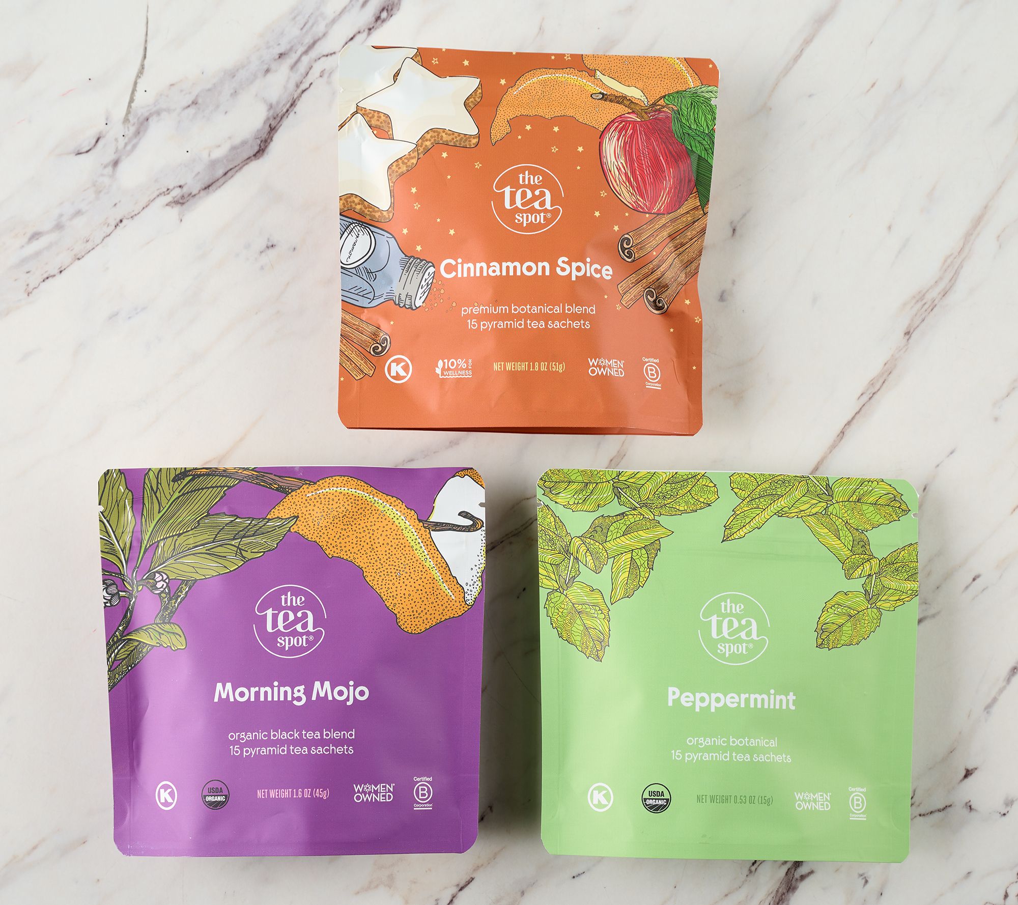 • Cinnamon Spice: lightly sweet blend featuring apple bits and orange peel; caffeine-free