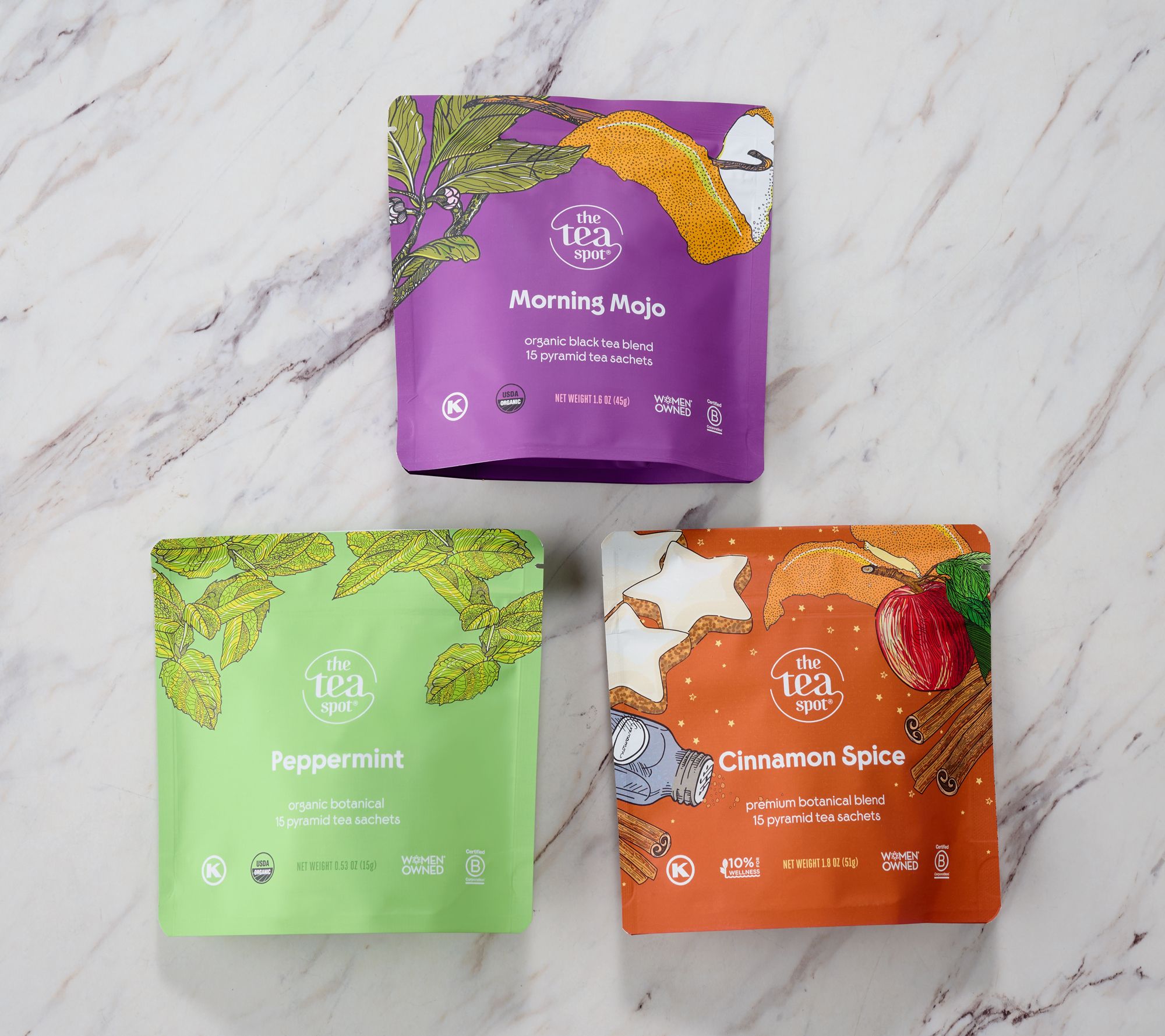 • Combo: 15 sachets each of Morning Mojo, Cinnamon Spice, and Peppermint