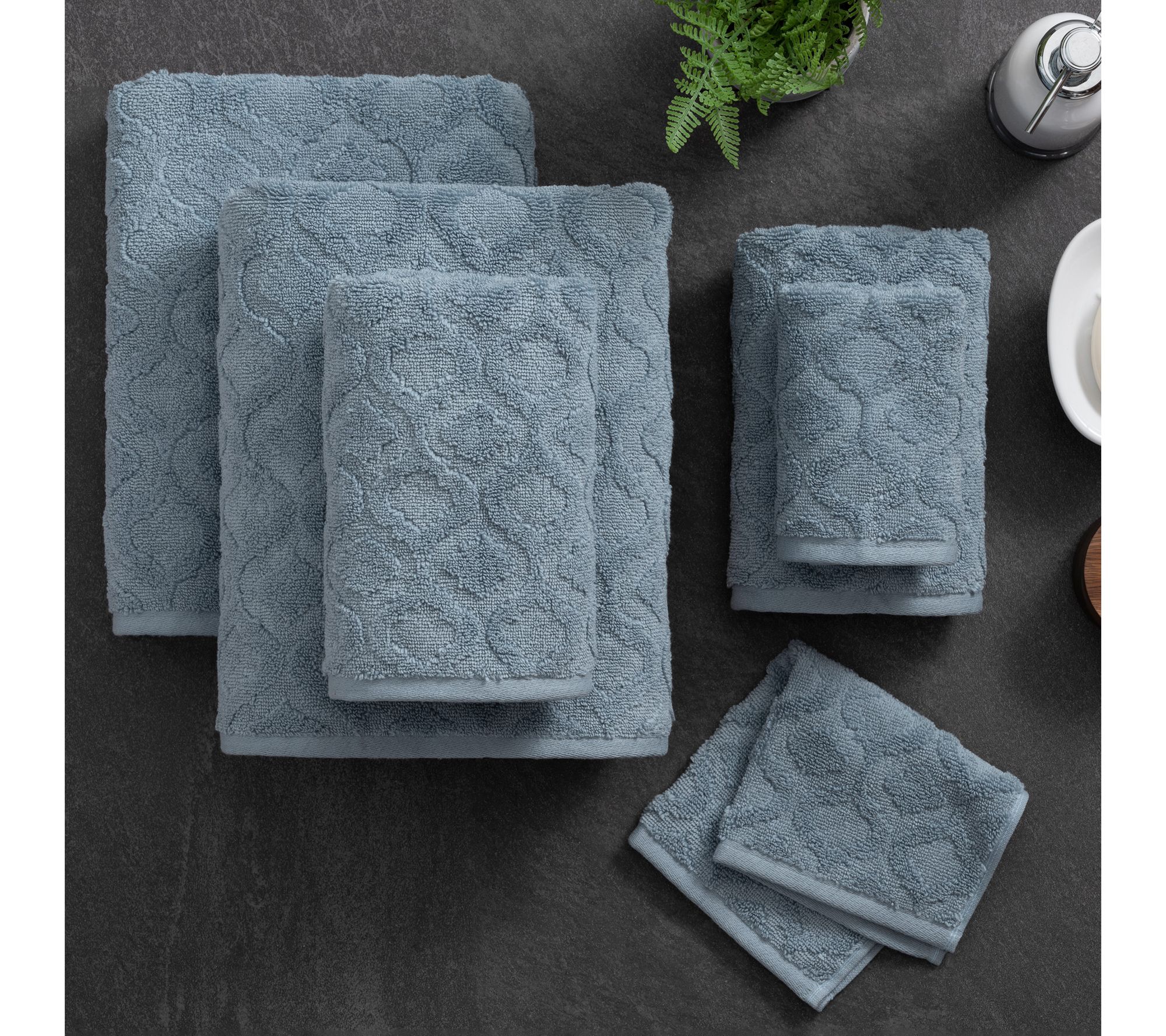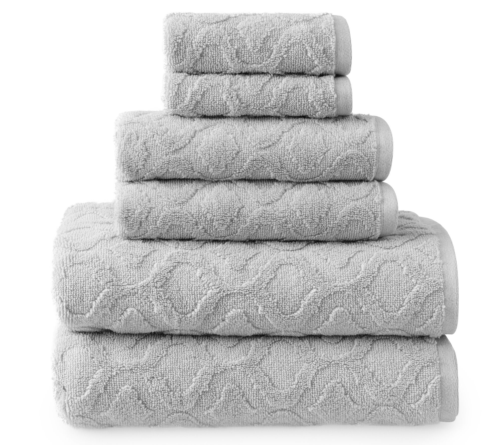 • Includes two washcloths, two hand towels, and two bath towels