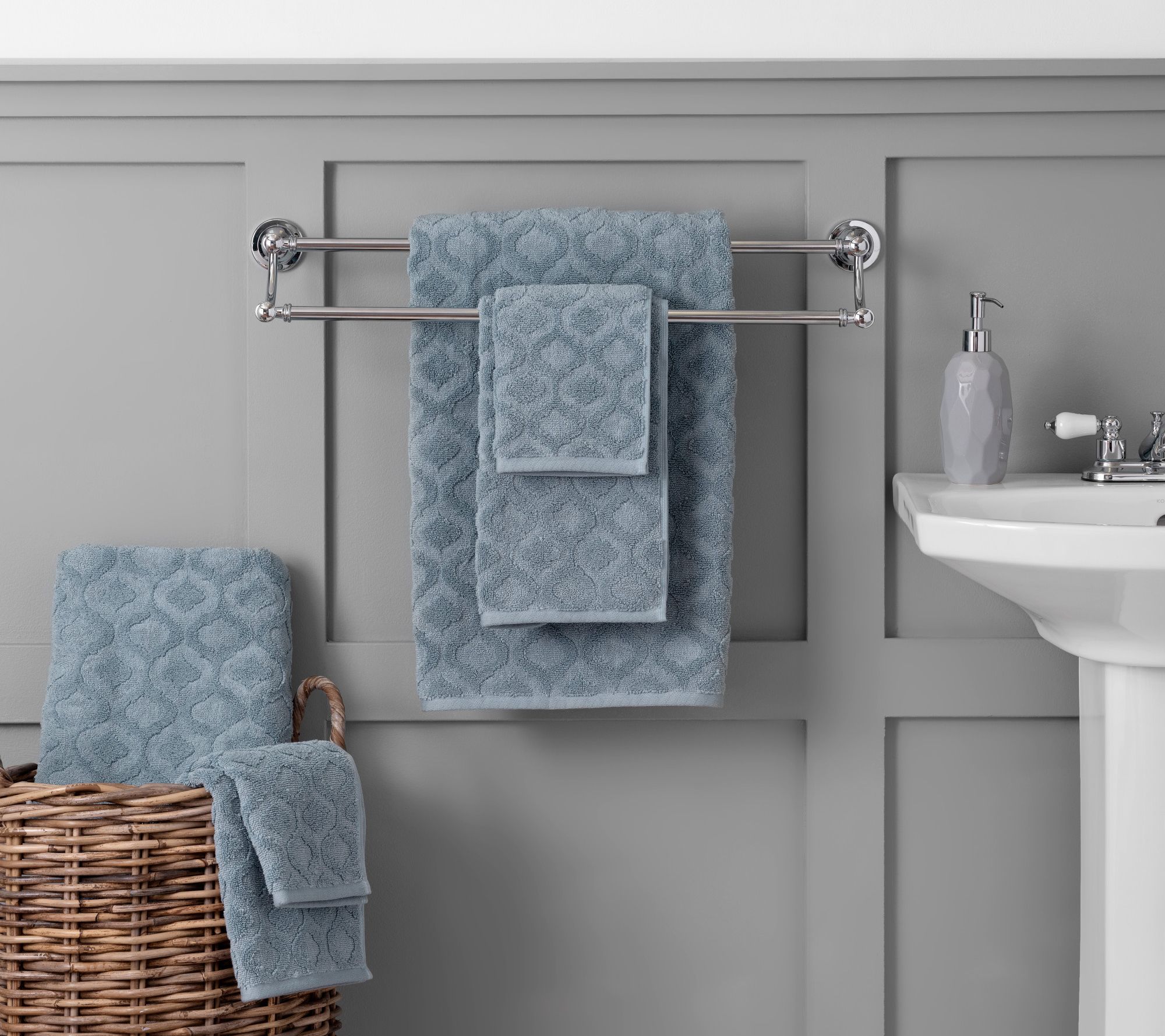 Add instant elegance to your bathroom with these cozy Athena towels, each boasting a graceful scroll design. From Wellhome.