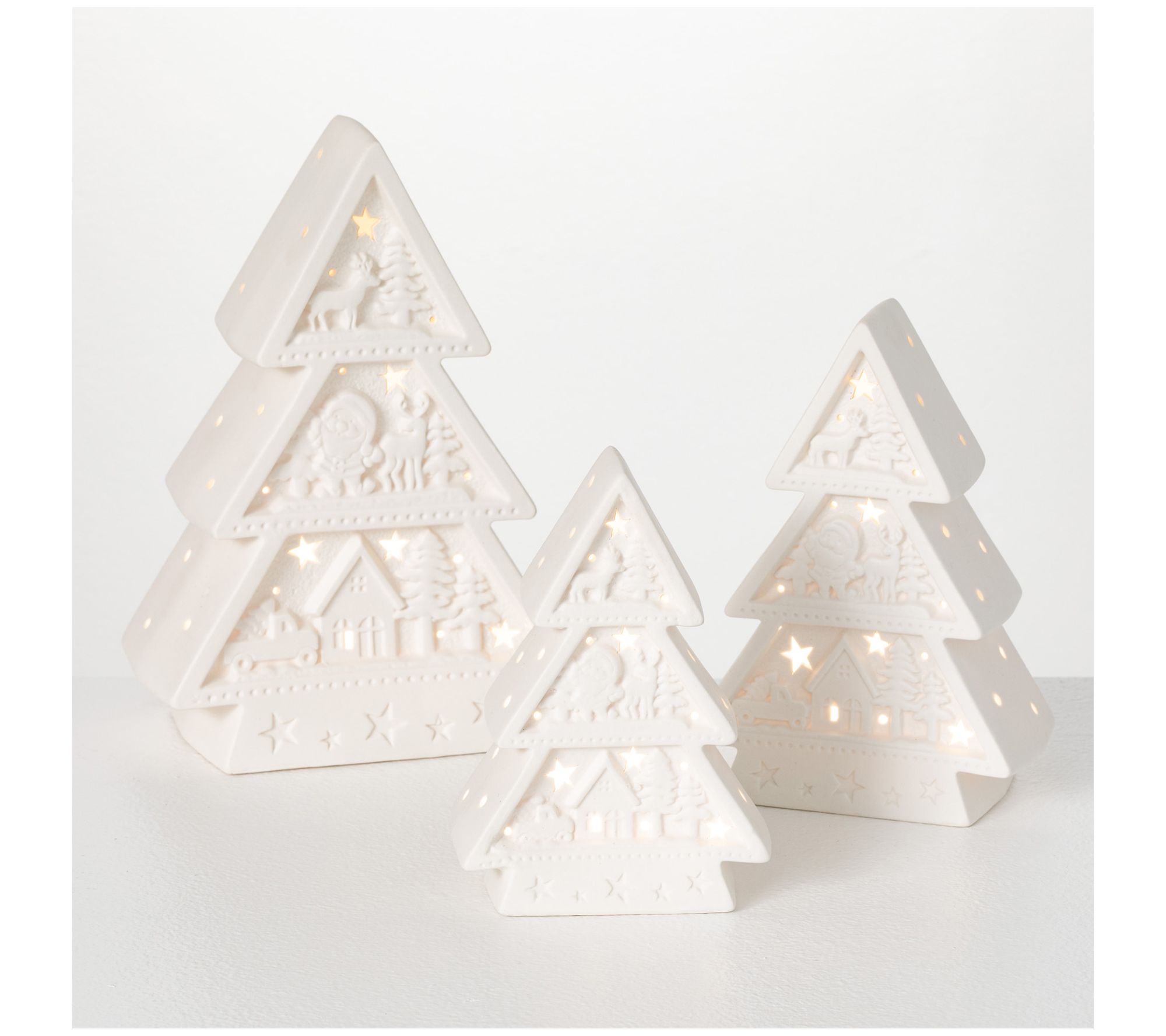 Offering festive etched scenes, fun cutouts, and a warm, welcoming glow, these three ceramic trees bring a touch of coziness to a shelf, table, or holiday mantel. From The Whitehurst Company.