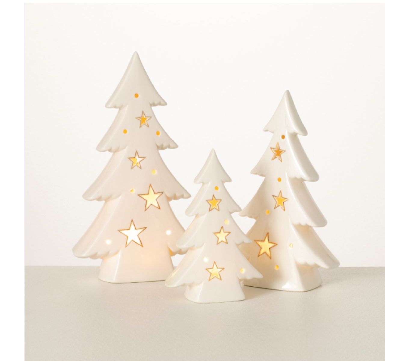 Sprinkled with goldtone accents and fun star cutouts, these LED trees are a beautiful way to bring holiday charm and a warm, cozy glow to a mantel, windowsill, or tabletop. From The Whitehurst Co.