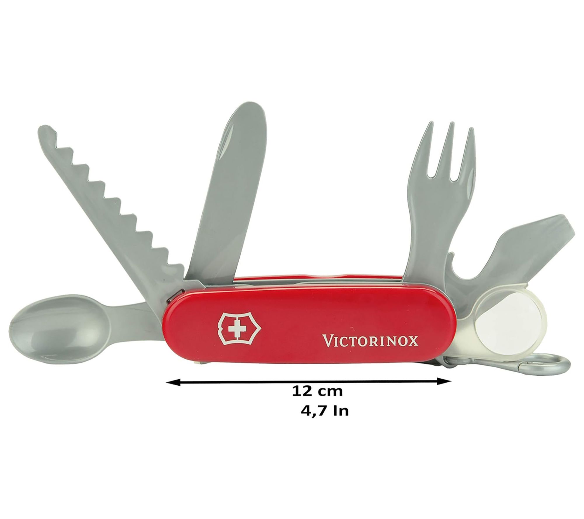 • Toy pocket knife with six tools: saw, knife, fork, spoon, bottle opener and magnifying glass
