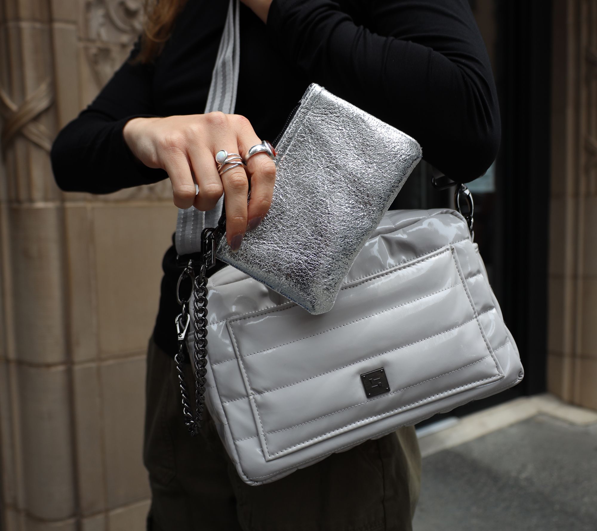 Carry everything you need in this quilted crossbody. The metallic wallet attaches with a chain strap, so your cash, cards, and keys stay stylishly secure. From Think Royln.