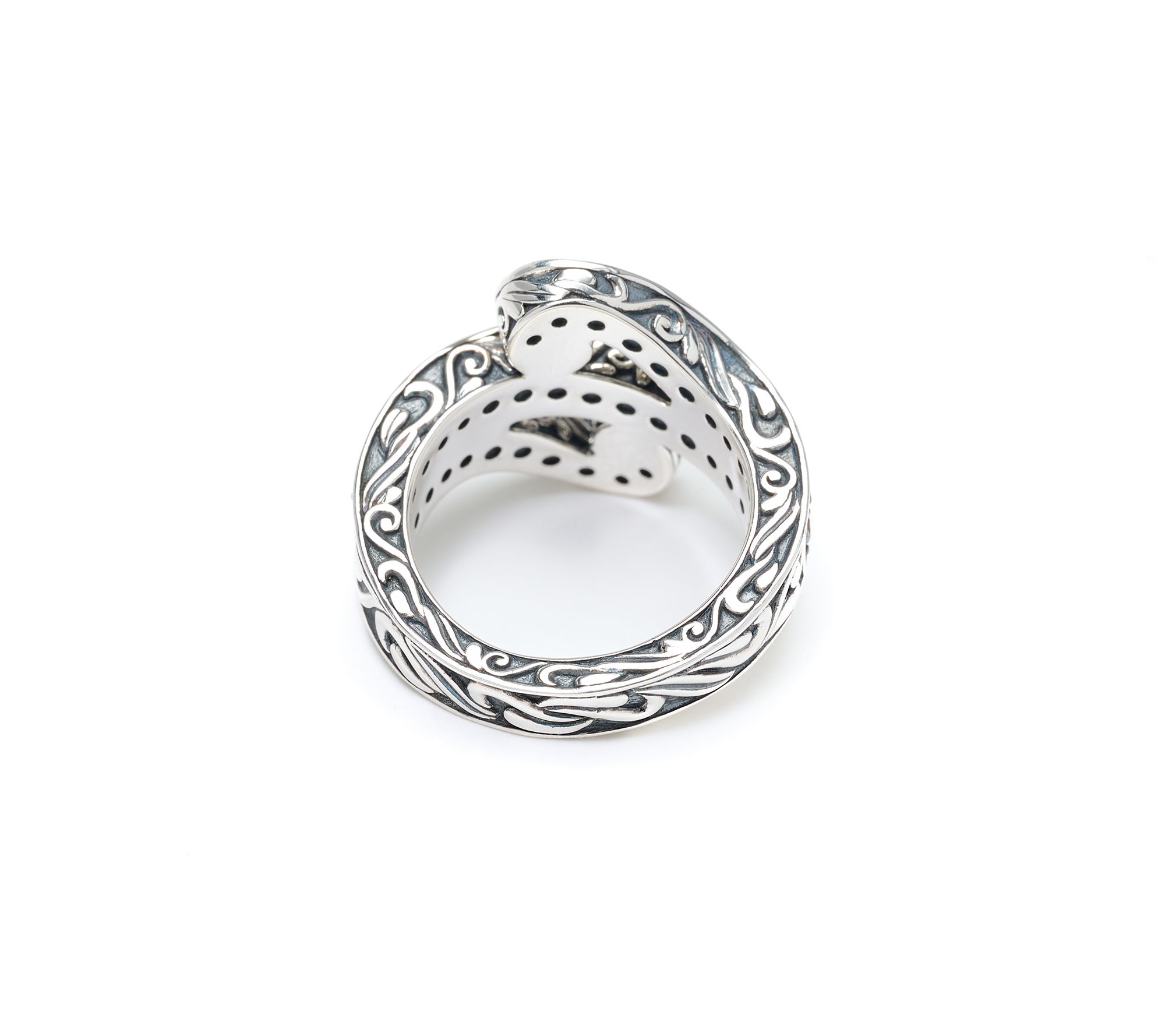 • Full-cut, round, pave-set gemstone swirl design; swirl texture on side; polished; oxidized