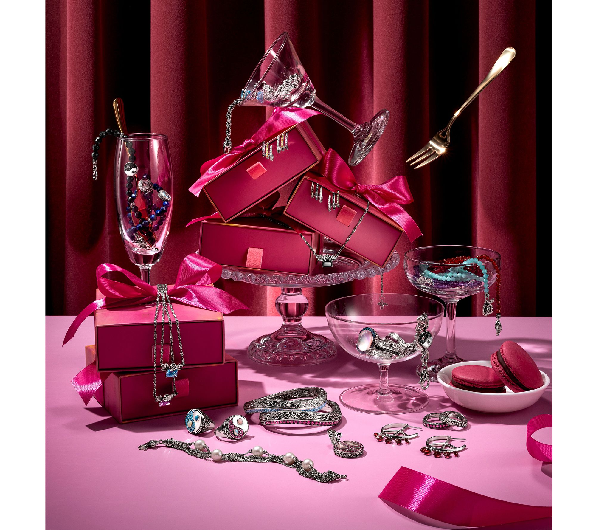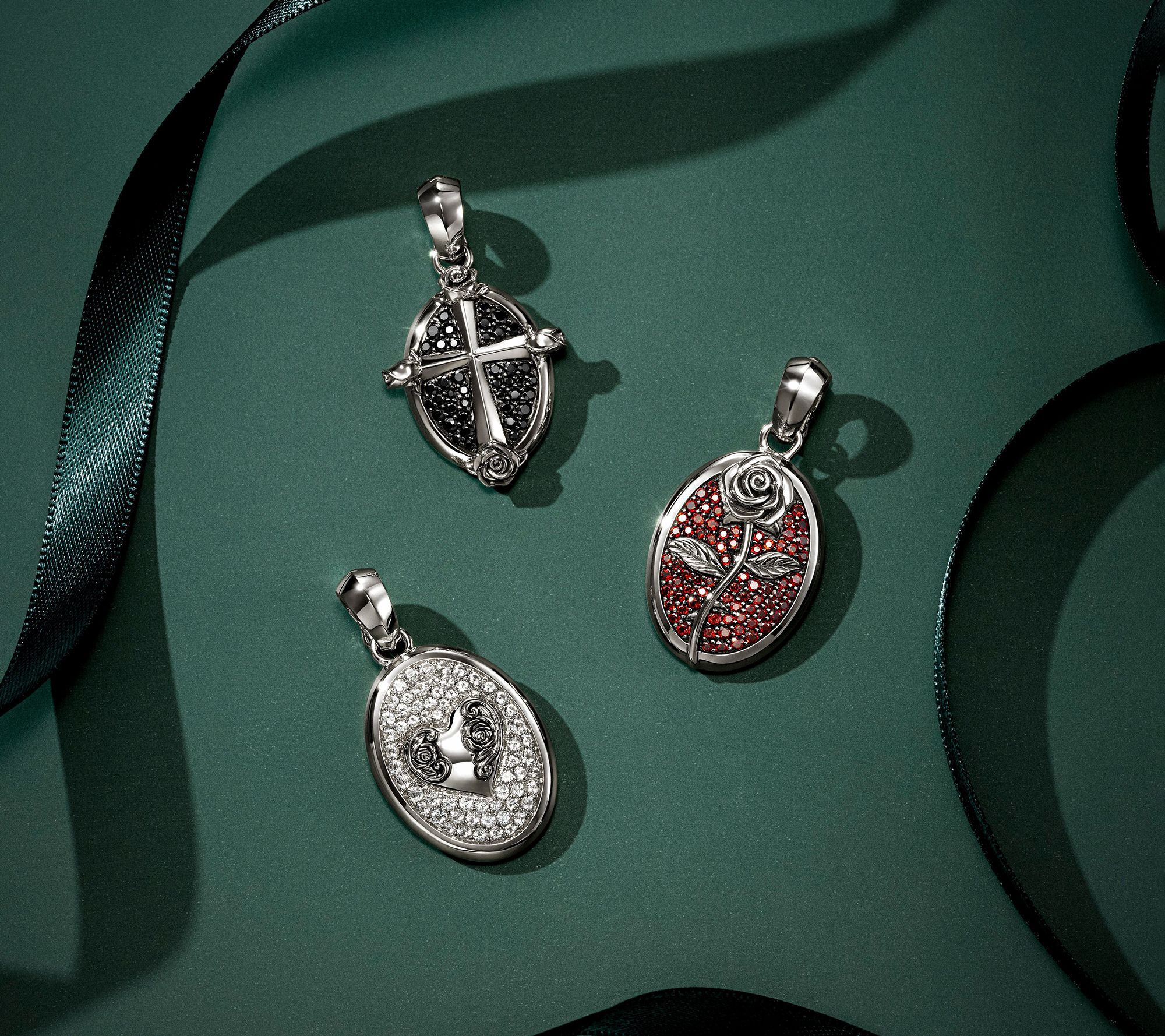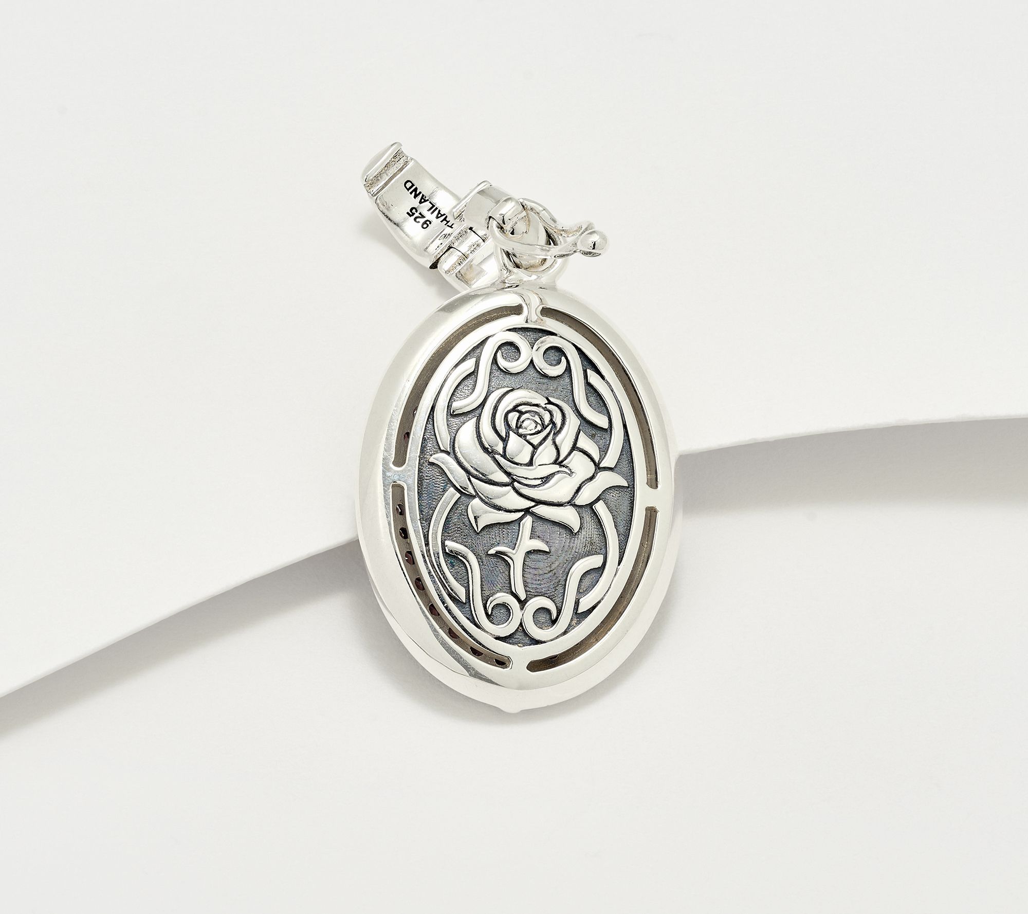 Oval enhancer design; full cut, round pave-set gemstones; carved rose details; polished and oxidized finish