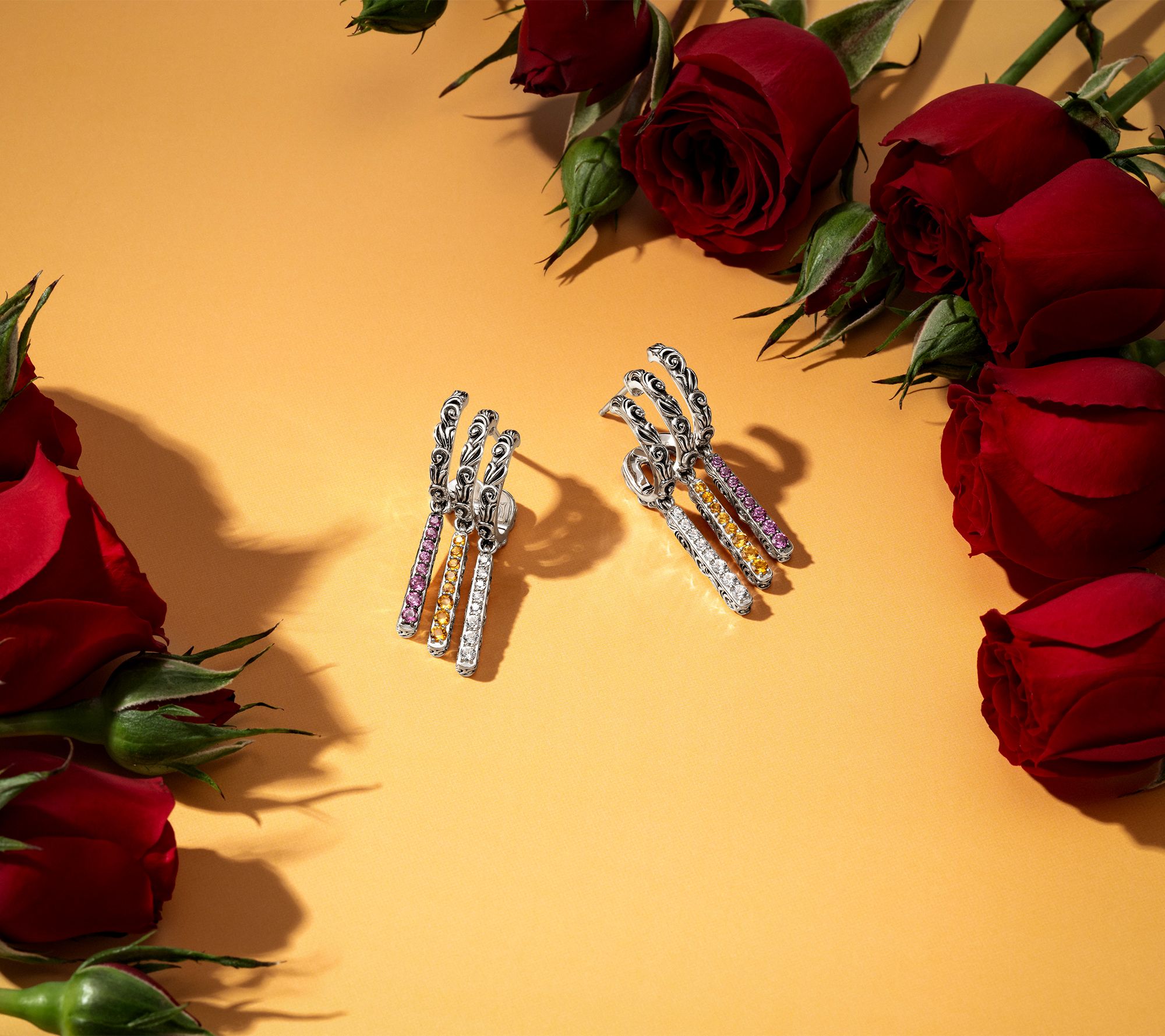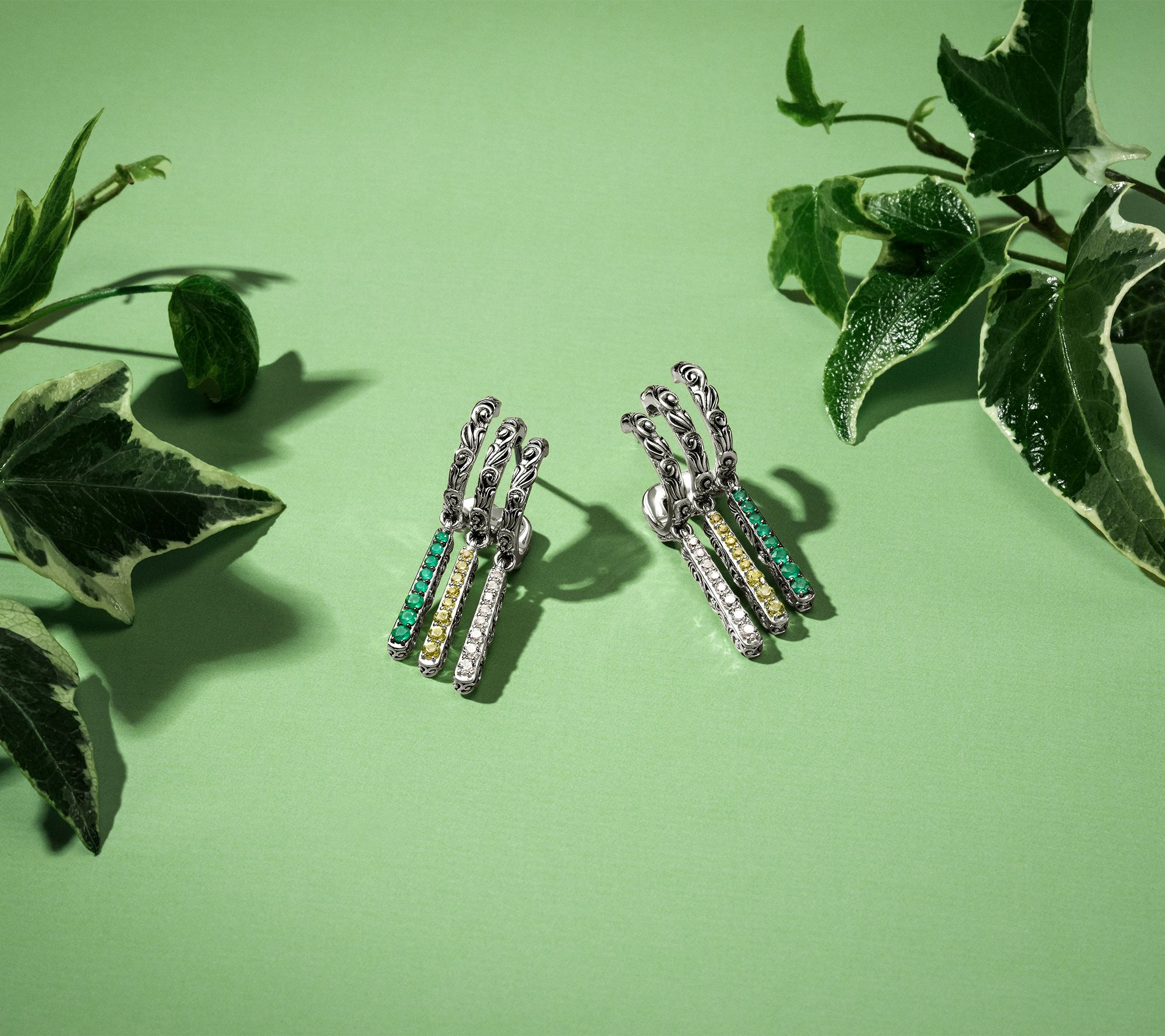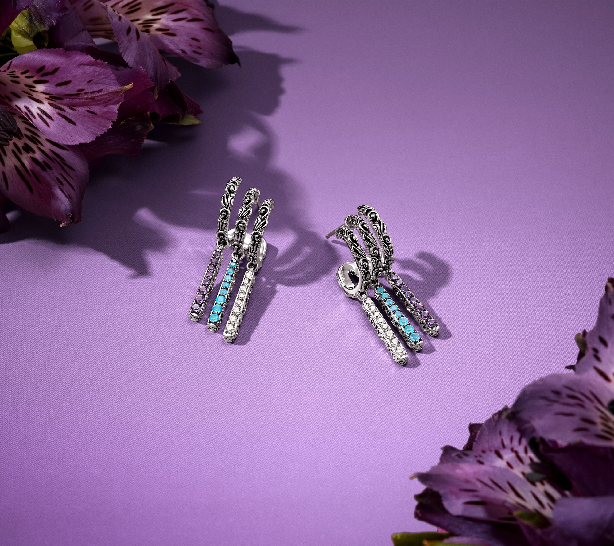 Embrace your wild side with these vibrant triple hoop earrings, complete with a trio of full-cut round gemstones that dazzle from every angle. From Third Person.