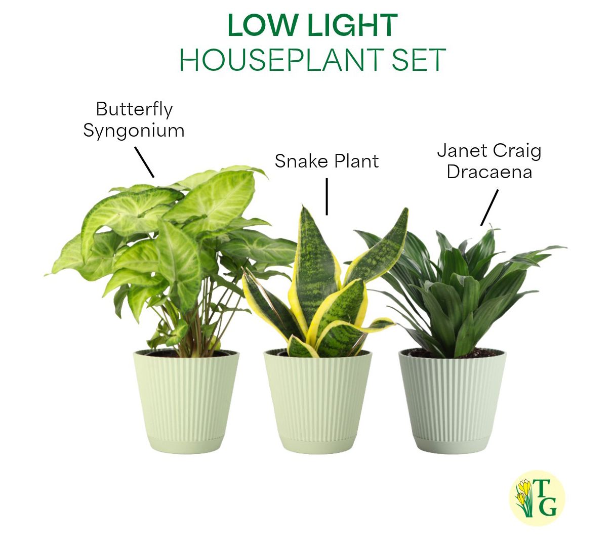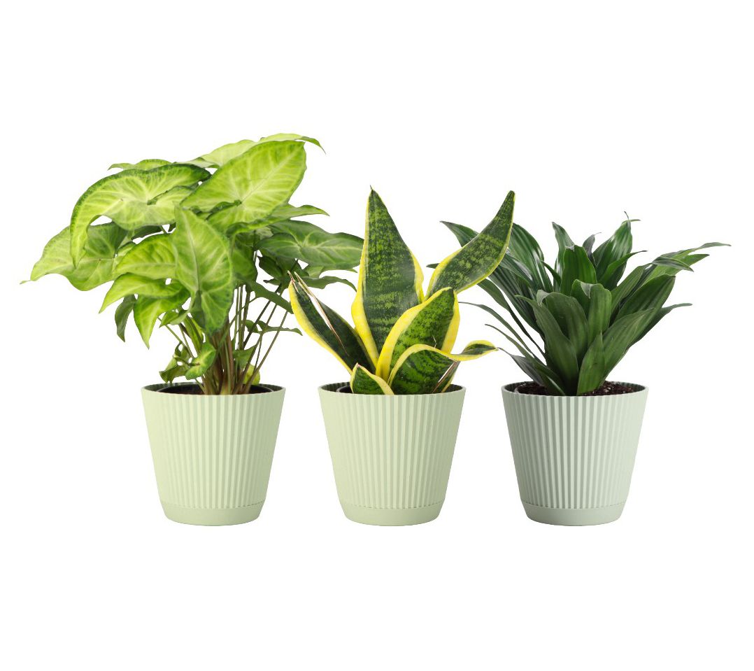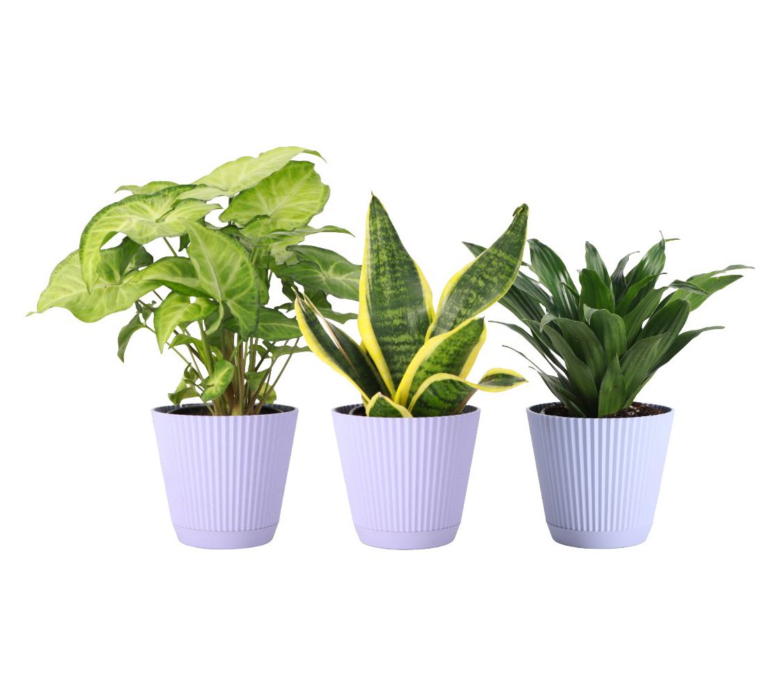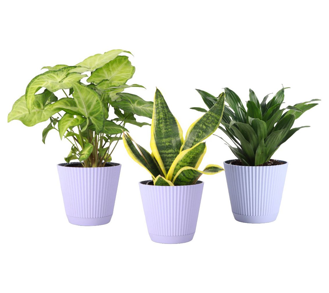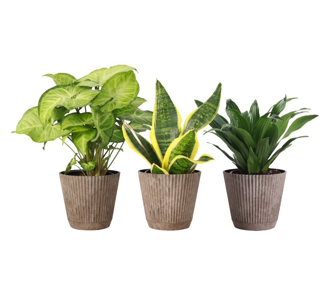 • Includes three live low light plants in plastic pot with detachable saucer: one each of Snake, Janet Craig Compacta, and Butterfly Syngonium