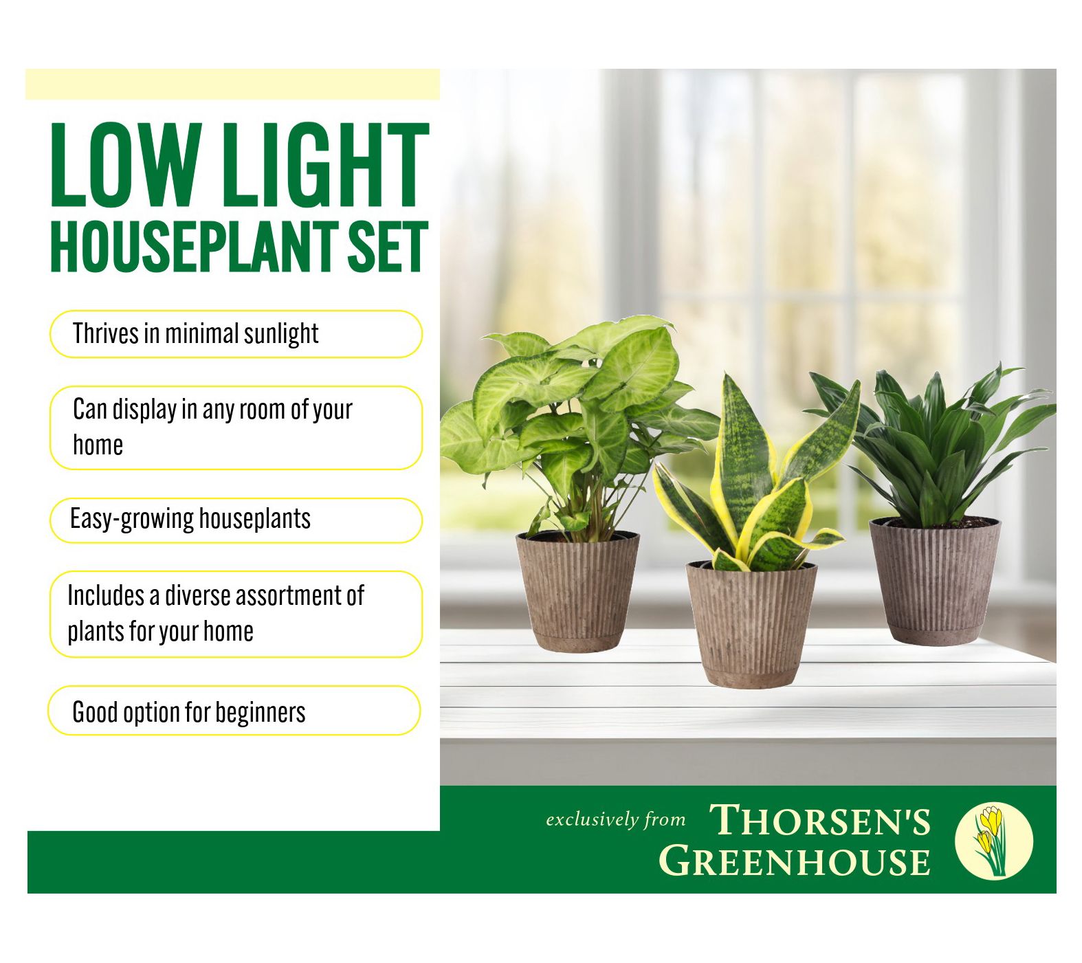 Busy mornings get a little brighter when greenery greets you in unexpected places. These low-light selections bring life to shelves, desks, and side tables, requiring just occasional care. With three varieties to style together or scatter throughout your home, relaxing natural vibes come easy -- even where sunlight is rare. From Thorsen's Greenhouse.