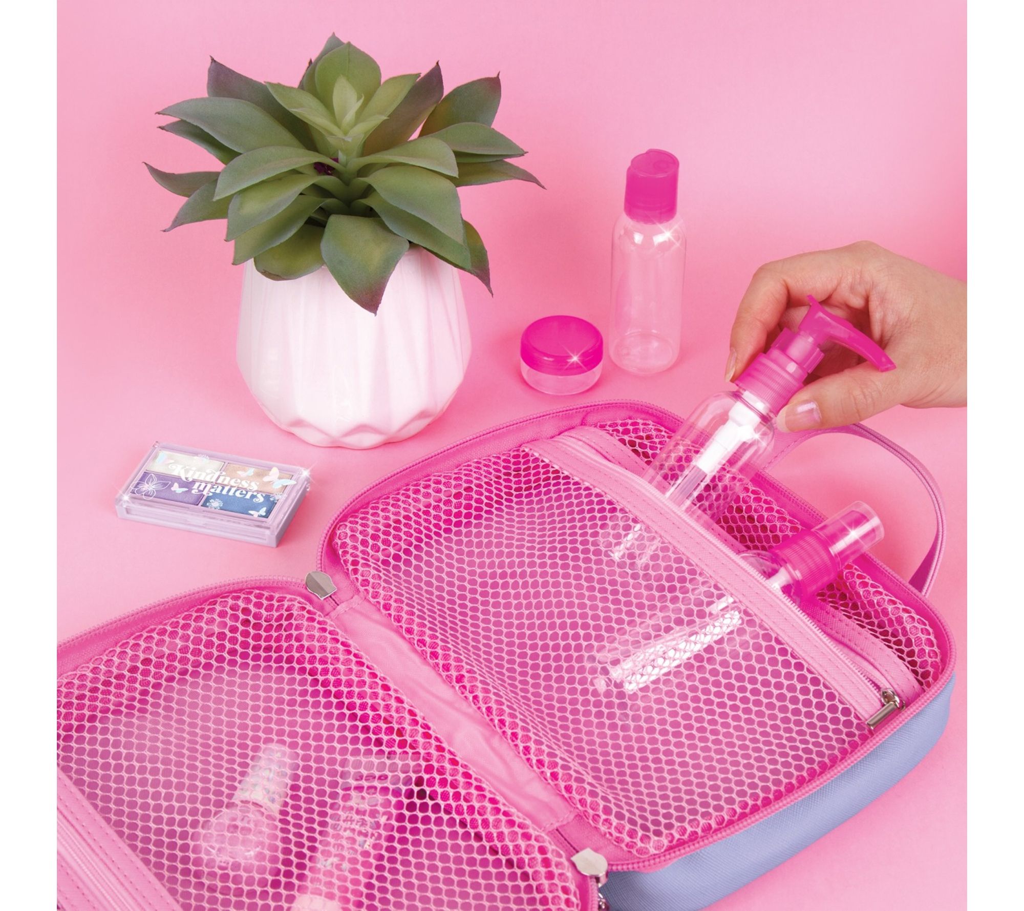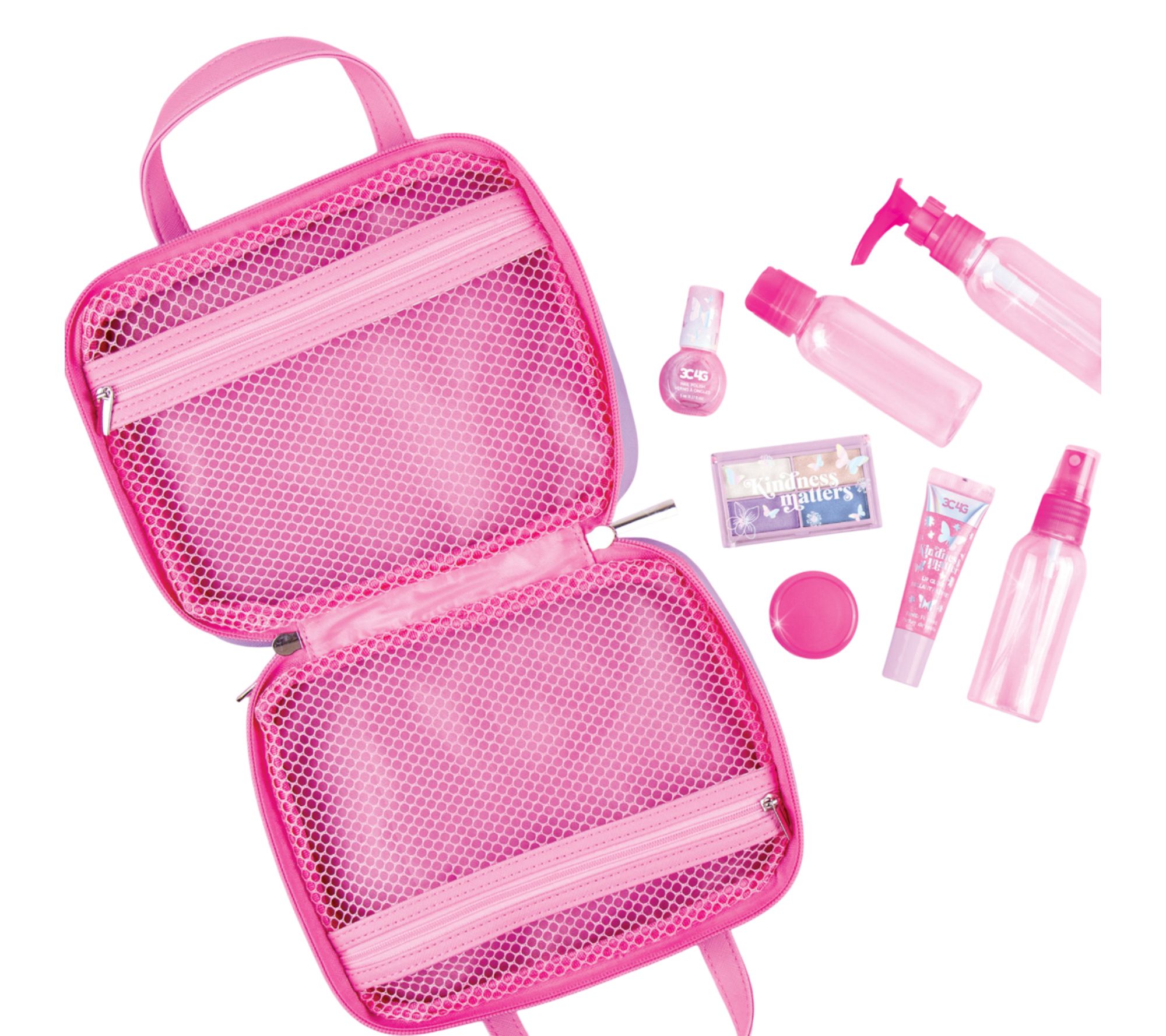 • Includes travel makeup carry case, lip gloss tube, pink nail polish, eyeshadow palette with four colors, three plastic bottles, one plastic jar
