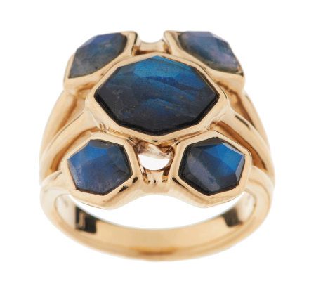 A doublet to covet. Make a statement without saying a word! Five bold, free-form labradorite gemstones sit atop a black onyx gemstone base for a rich depth of color in this polished 14K yellow gold ring.
