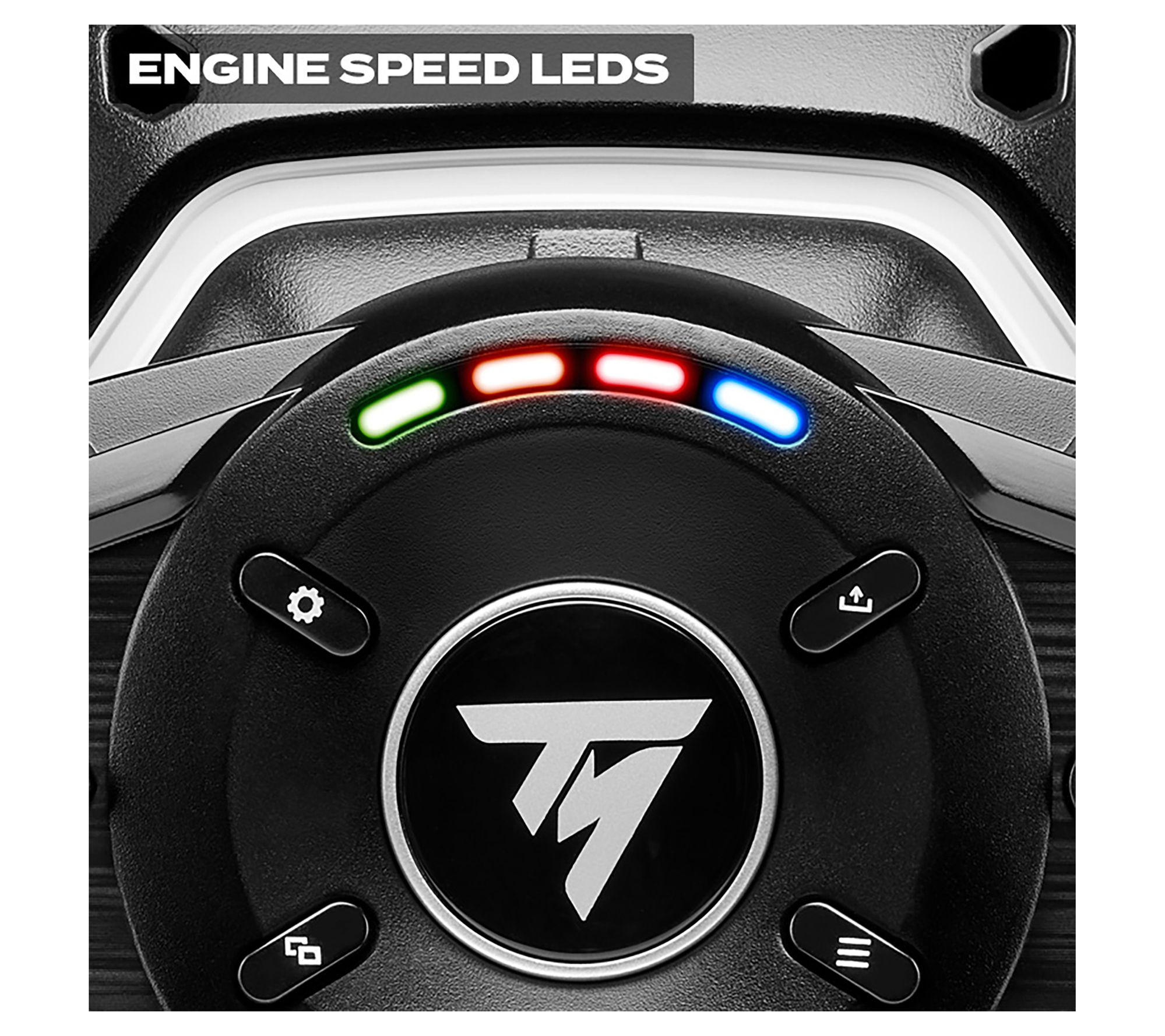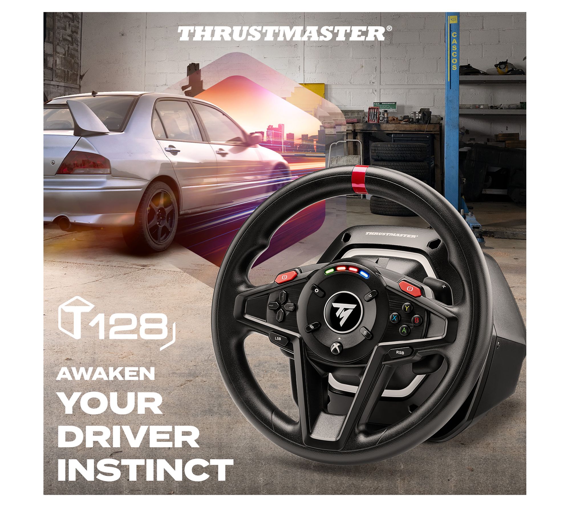 Feel every turn with the Thrustmaster T128X Racing Wheel and sleek magnetic pedals -- whether you're gaining ground on a virtual track, perfecting your lines, or reacting to each surge of force feedback. The vivid LED strip guides your shifting, while desk-friendly mounting and frictionless pedal precision help you dive into the world of racing at home. From Thrustmaster.