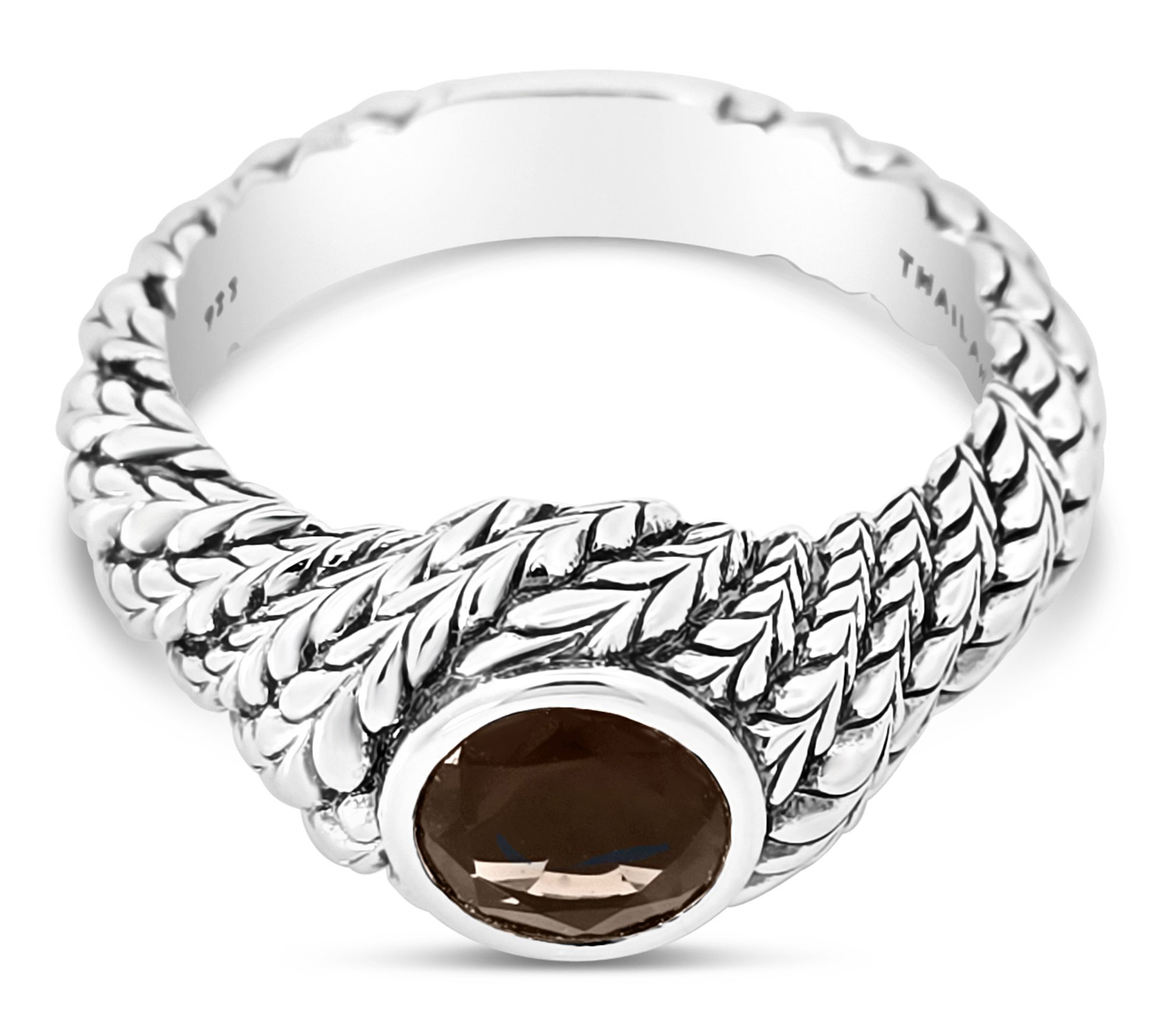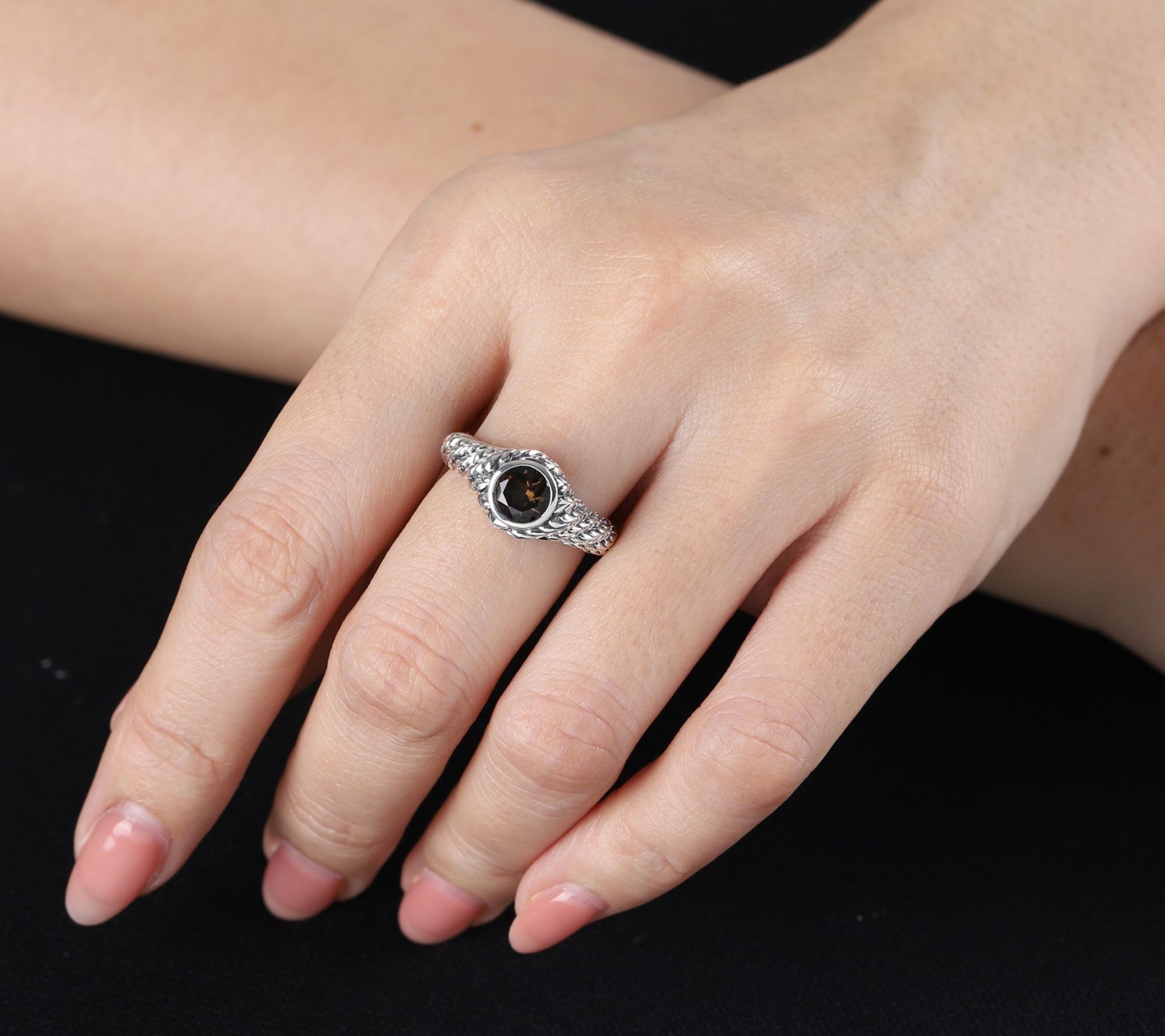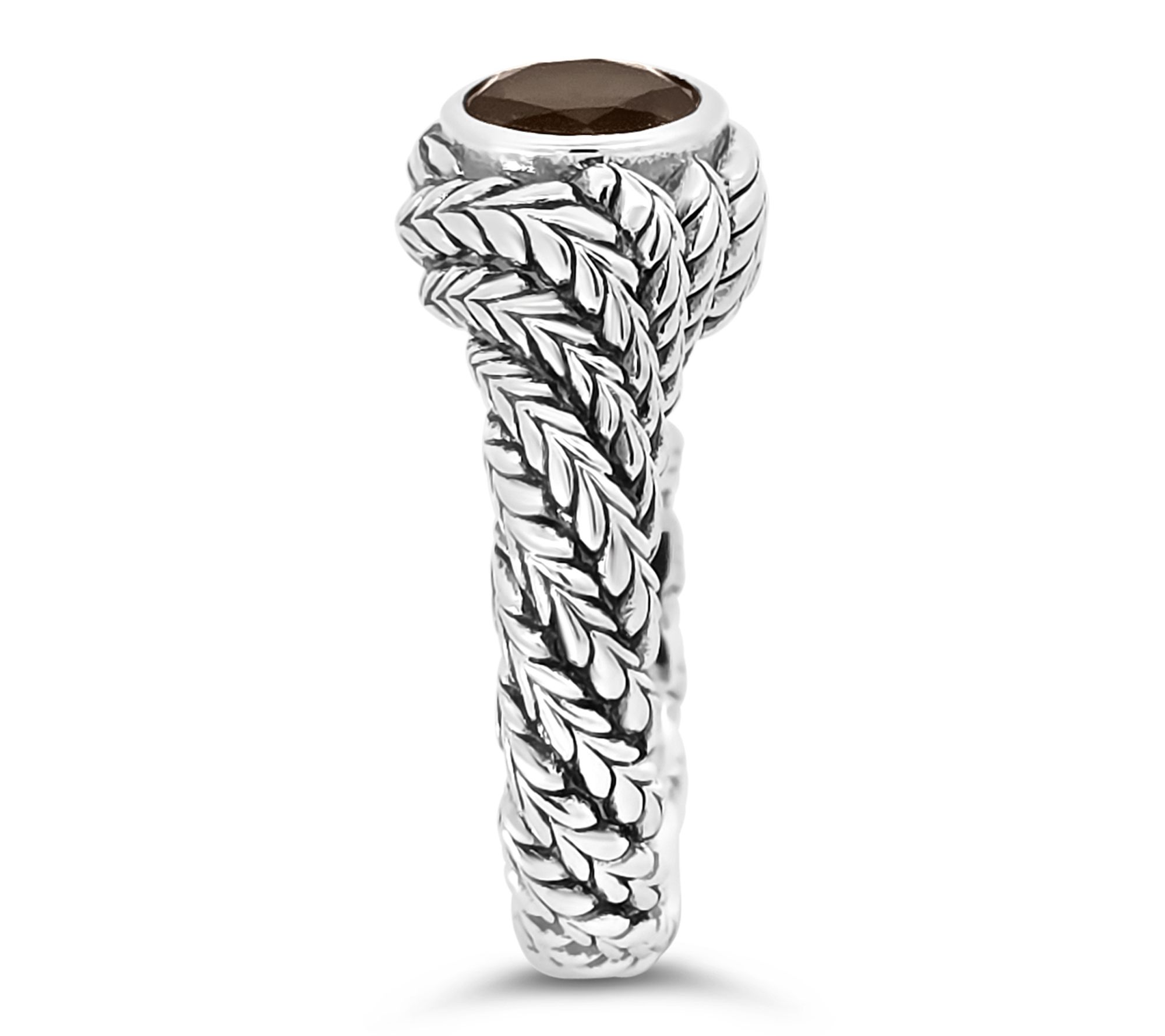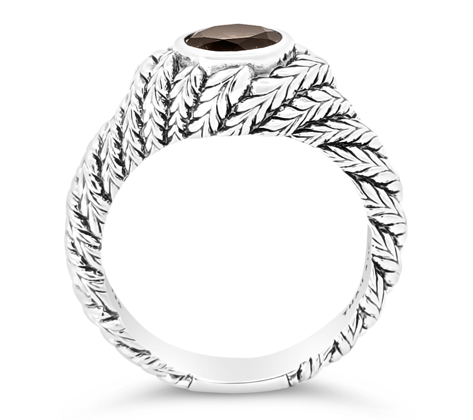 An evening out with friends or a special lunch date is the ideal occasion to show off this ring's striking smoky quartz, elegantly set in a sterling silver herringbone band with a twirling twist. The captivating mix of modern shine and warm earthy depth adds just the right accent to your favorite dresses or casual denim. From Tiffany Kay.
