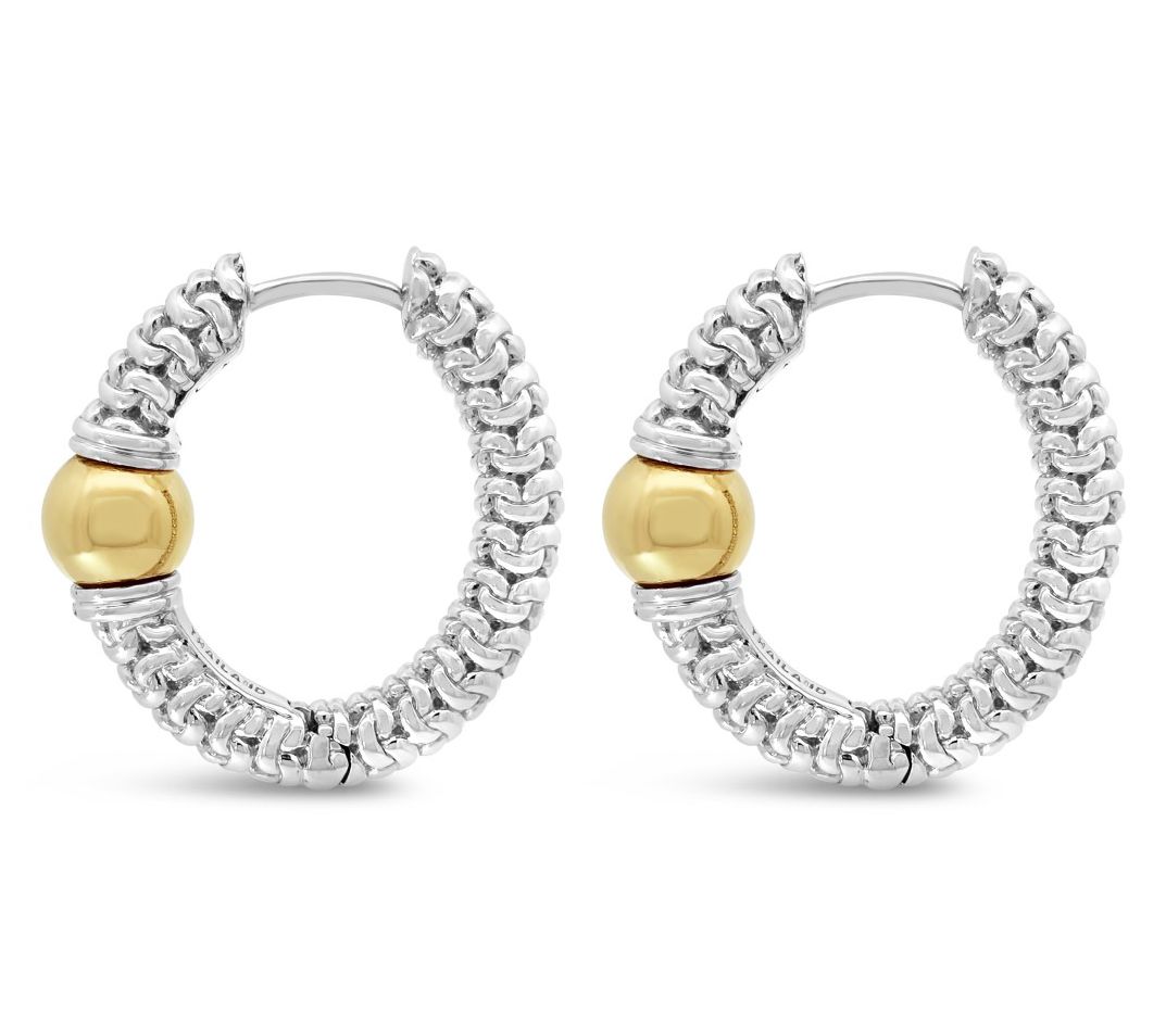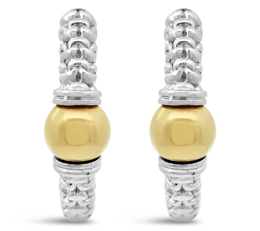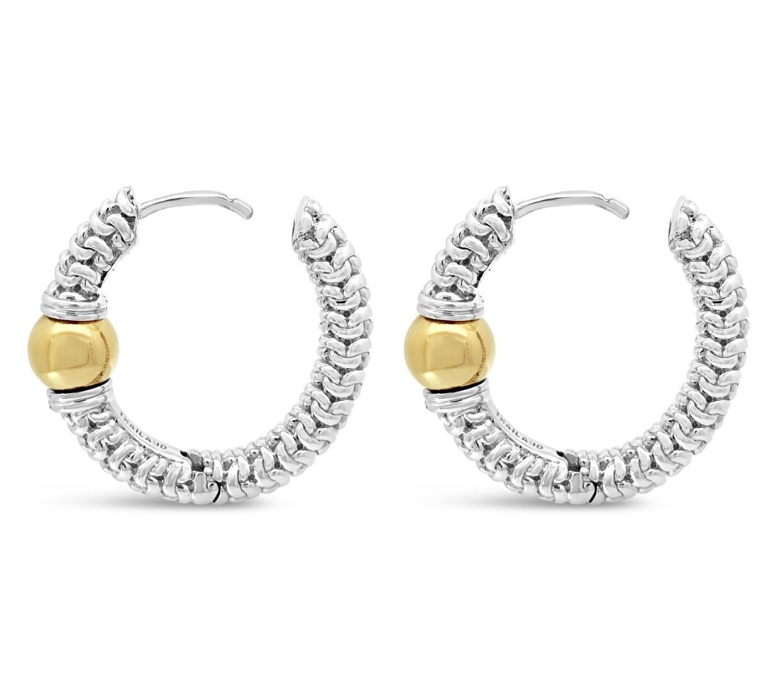 Start your day with an effortless blend of shine and sophistication -- these polished hoops bring sterling silver and 14K yellow gold-clad details together for a look that's easy to dress up or down. A purl knit texture adds a playful twist, while the center bead glows with golden warmth. Go from work meetings to dinner plans without missing a beat. From Tiffany Kay Studio.