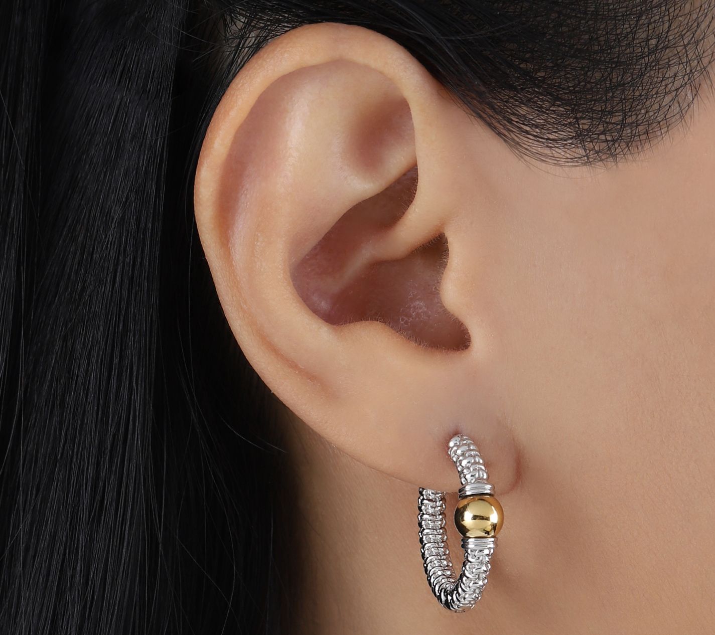 • Purl knit textured hoop; 14K yellow gold-clad bead in center; two-tone design