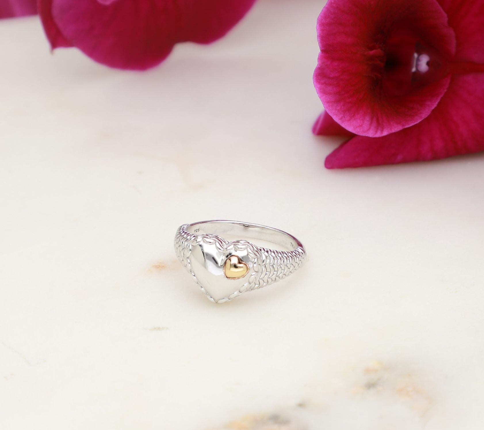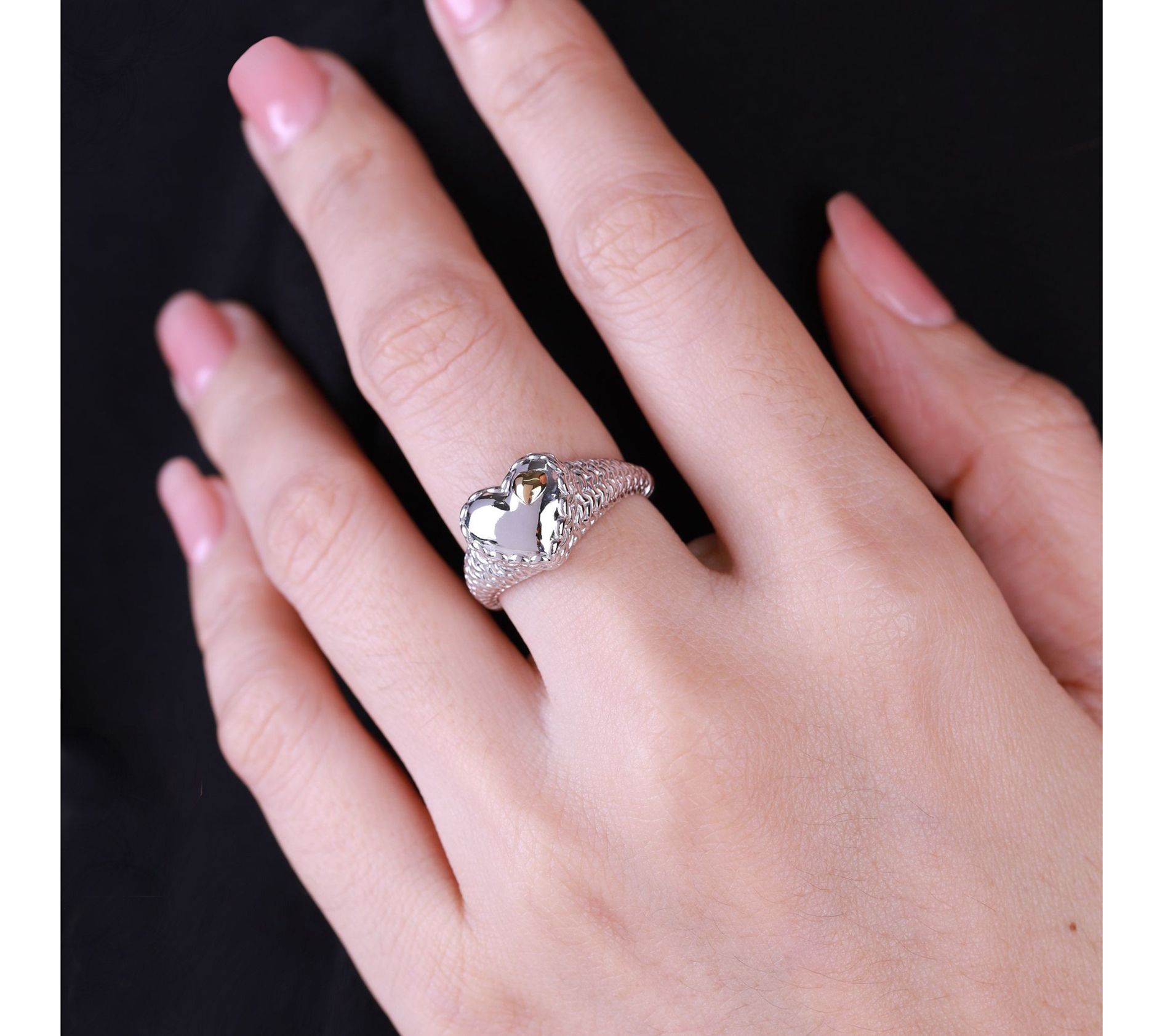 • Center high-polish heart with small 14K yellow gold-plated sterling silver heart on top; sterling silver purl knit textured band