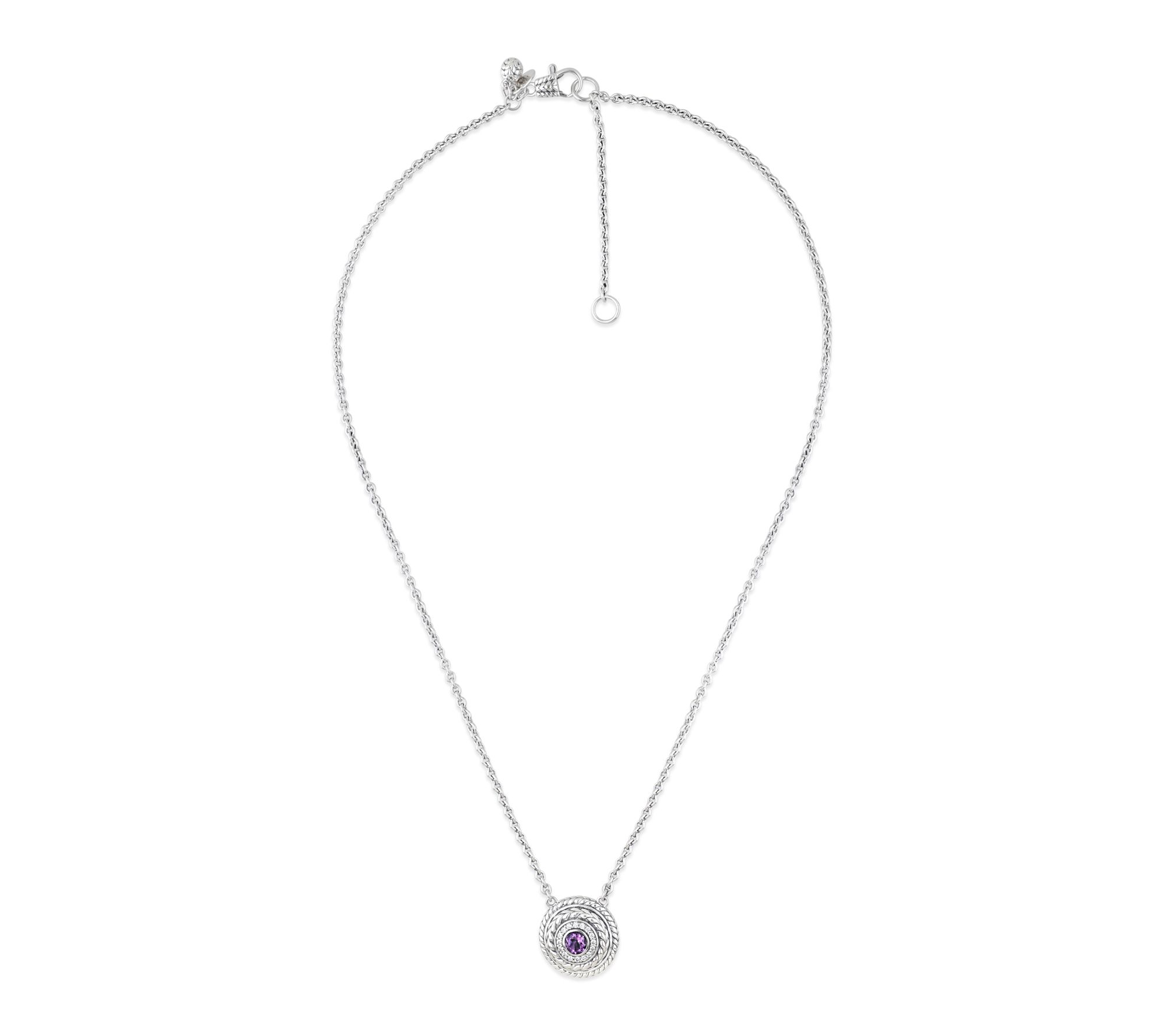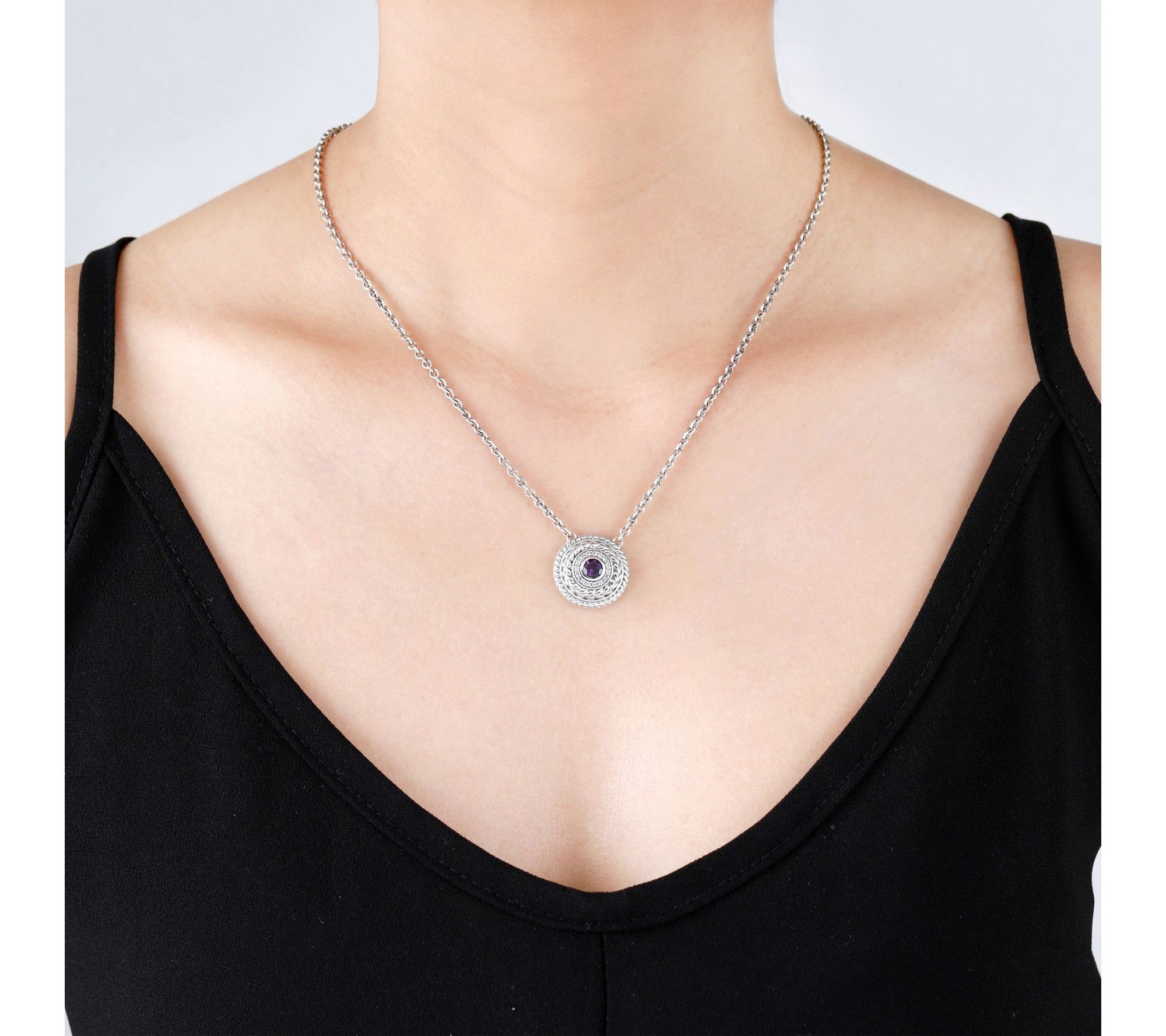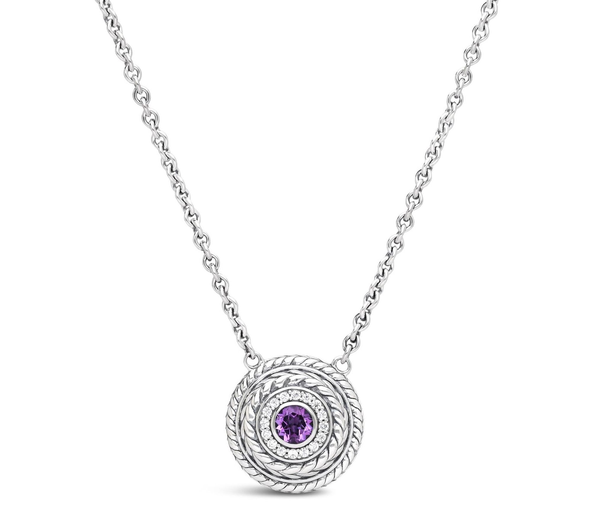Round-cut bezel-set amethyst in center; pave-set Diamonique simulated diamonds; herringbone-textured outer frame; traditional circle pendant