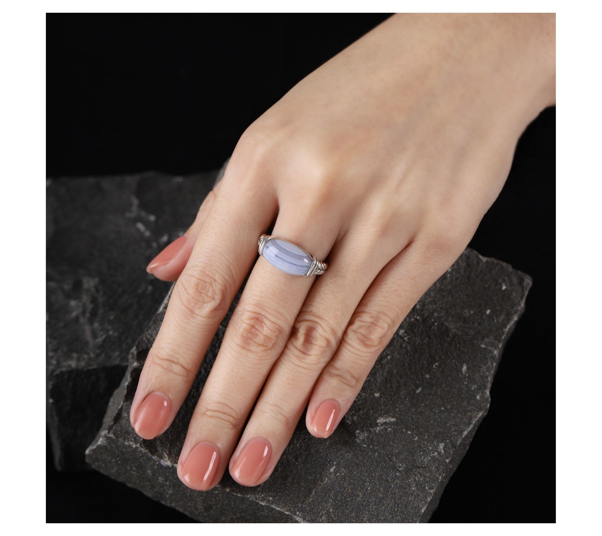 Blue lace agate cabochon; inlay setting; herringbone texture