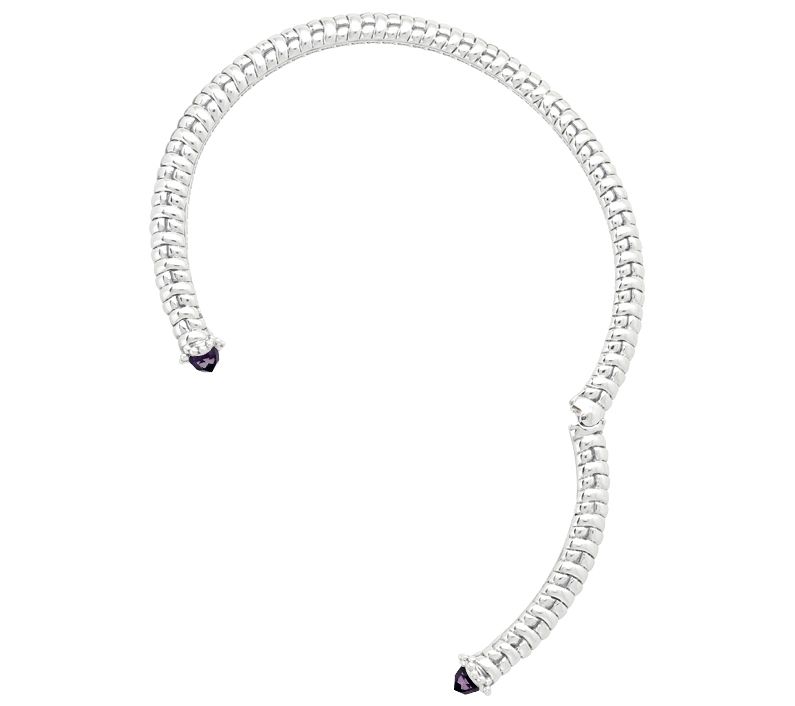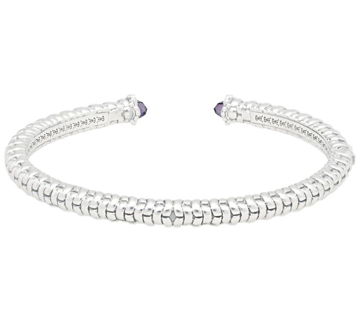 Showcasing a sterling silver knitted texture, this gorgeous and easy-to-wear hinged cuff bracelet boasts amethyst endcaps for a dazzling final touch. From Tiffany Kay.