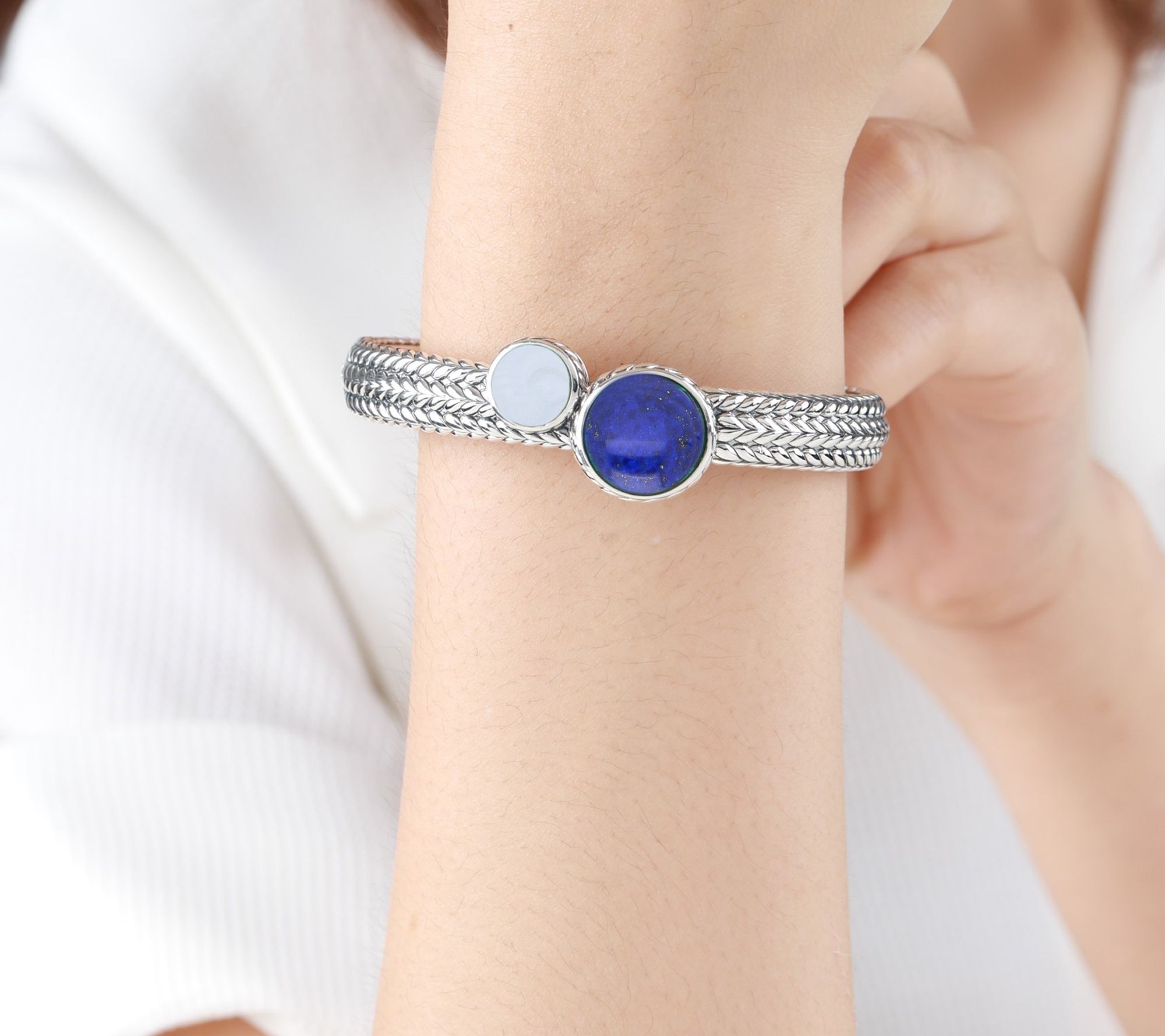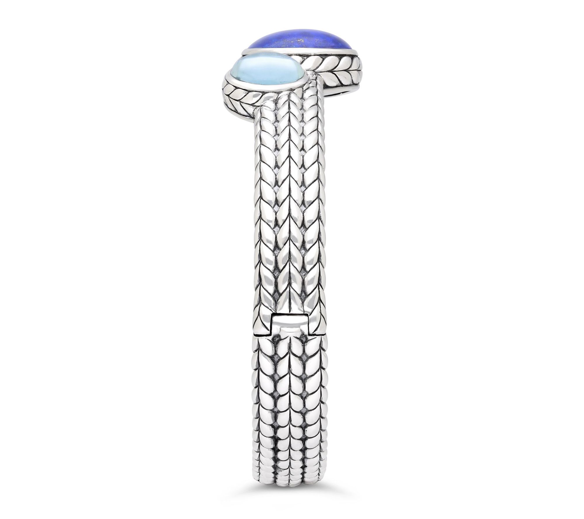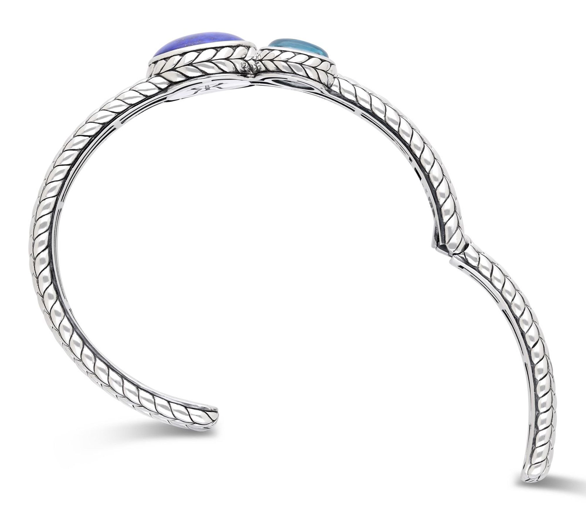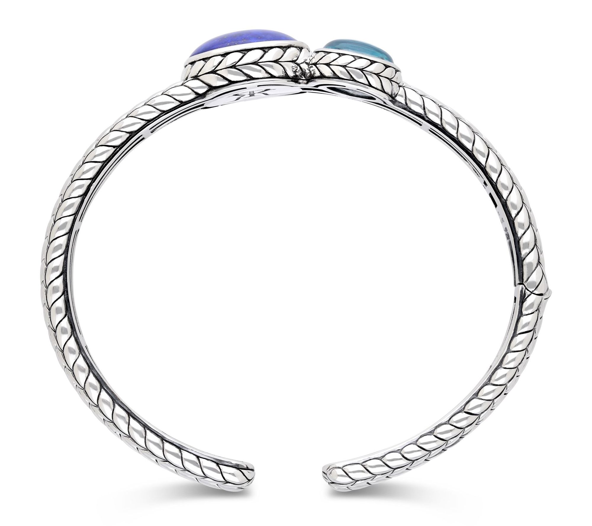 Make a statement at your next dinner party or add a splash of color to your daily wardrobe with this striking cuff bracelet. Genuine lapis and sky blue topaz stones shimmer against a herringbone-textured sterling silver band, while the hinge clasp ensures effortless wear. From Tiffany Kay Studio.