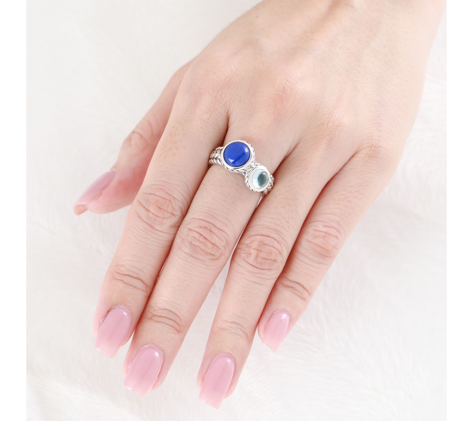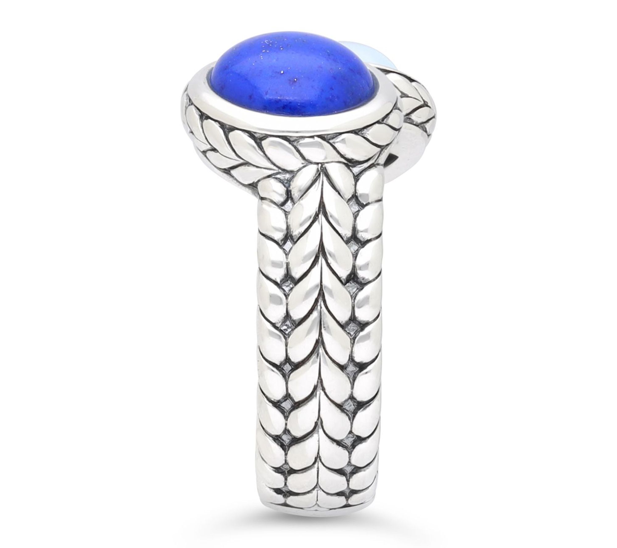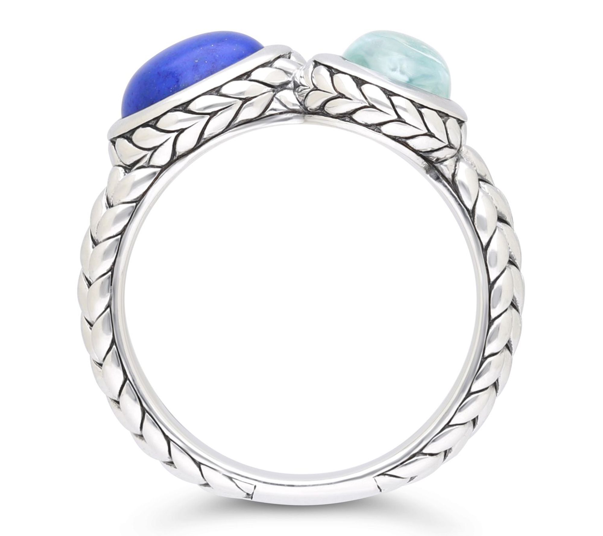 Bezel-set sky blue topaz and lapis gemstones; herringbone texture; polished finish