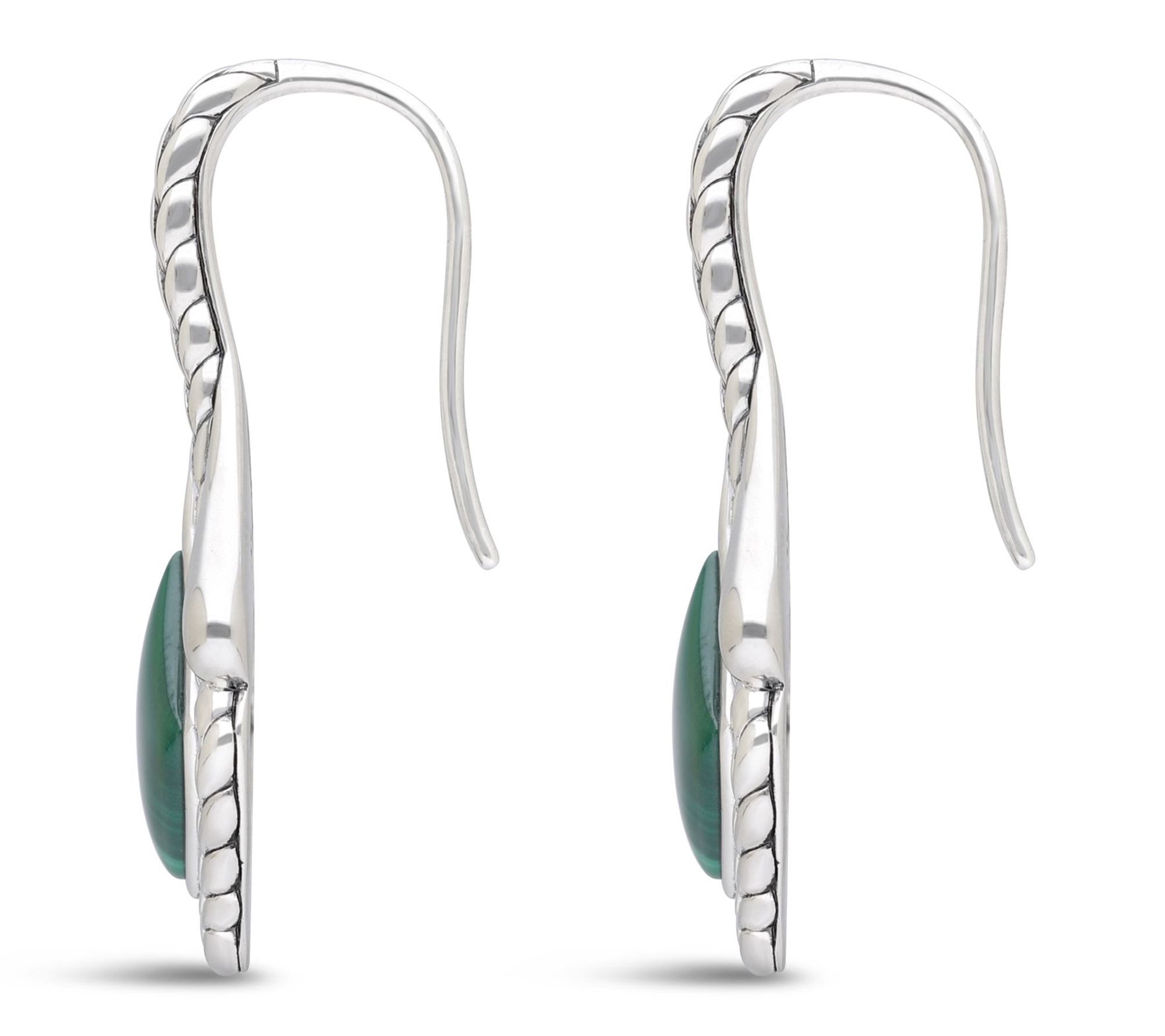 • Dangling design; fancy-cut, inlay-set malachite cabochon; herringbone texture