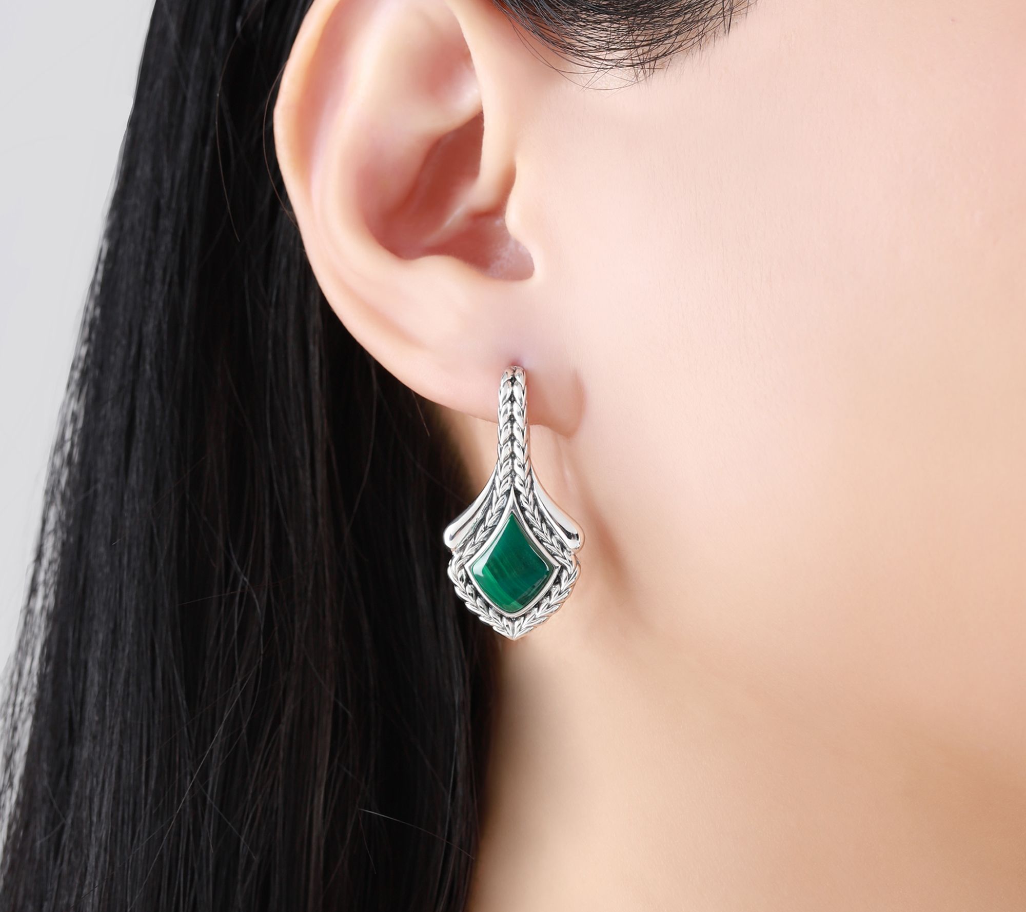 Add a sophisticated touch to your ensemble with these sterling silver dangle earrings, featuring fancy-cut malachite cabochons in a striking herringbone texture. Whether you're dressing up for brunch or adding a pop of color to your workday look, their vibrant green stones and artistic design instantly draw the eye. From Tiffany Kay Studio.