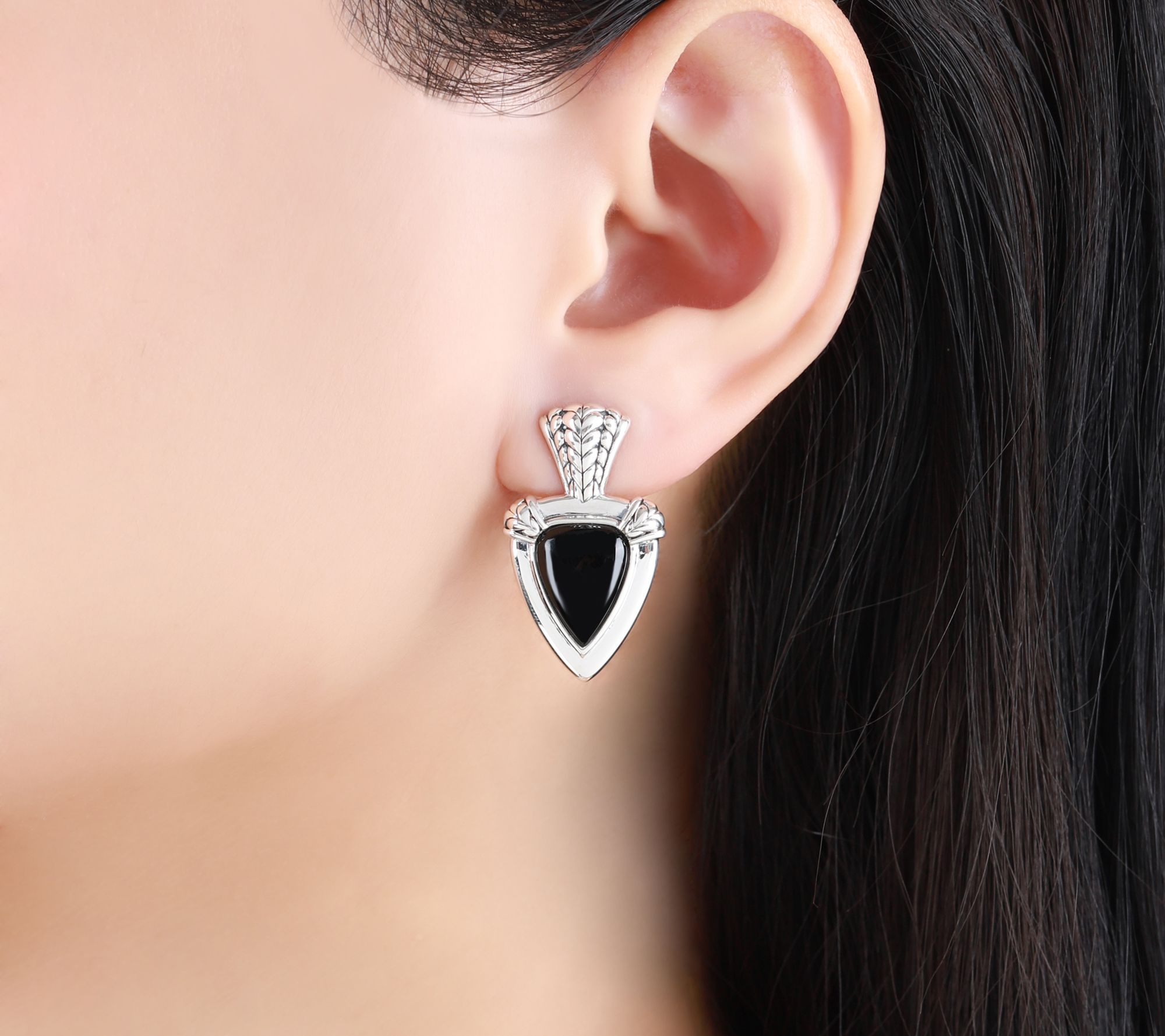 Transform your look with these bold shield doorknocker earrings that showcase a striking black onyx stone in a high-polish sterling silver setting. The eye-catching herringbone accents and elegant top detail add a touch of sophisticated edge, making them a standout accessory for occasions from dinner out to special celebrations. From Tiffany Kay Studio.