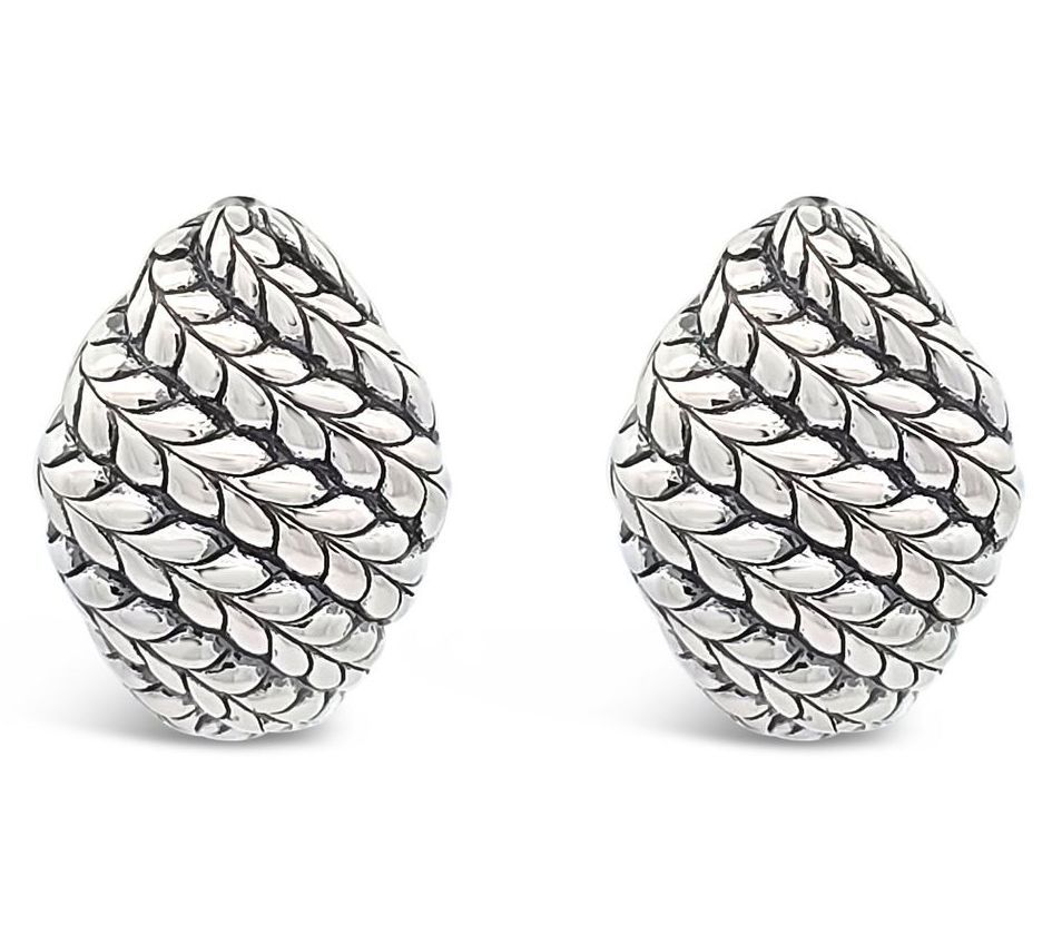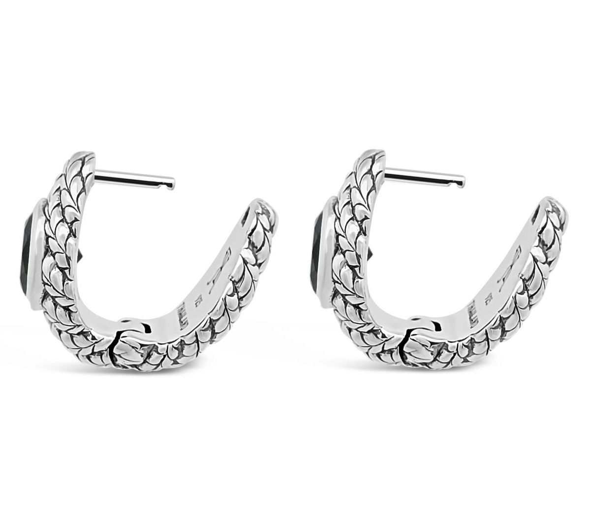 Black onyx cabochon inlay; herringbone-textured huggie hoop design