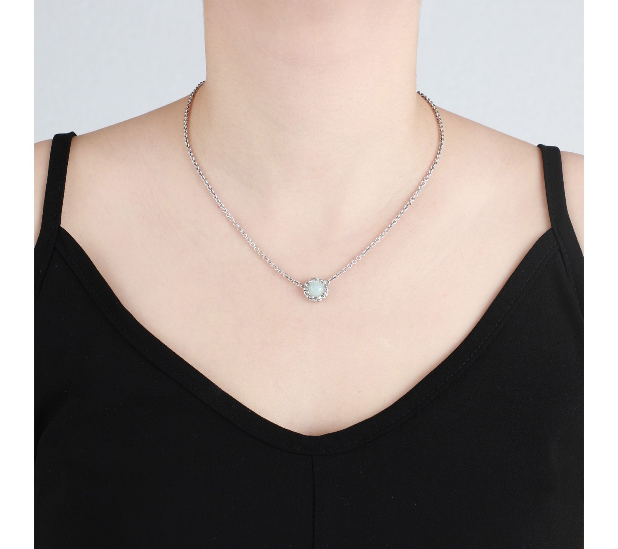 • Round, inlay-set milky aquamarine gemstone framed by purl knit-inspired textured sterling silver