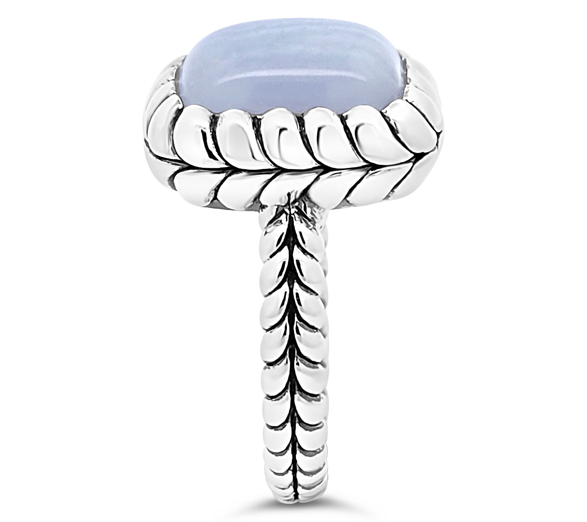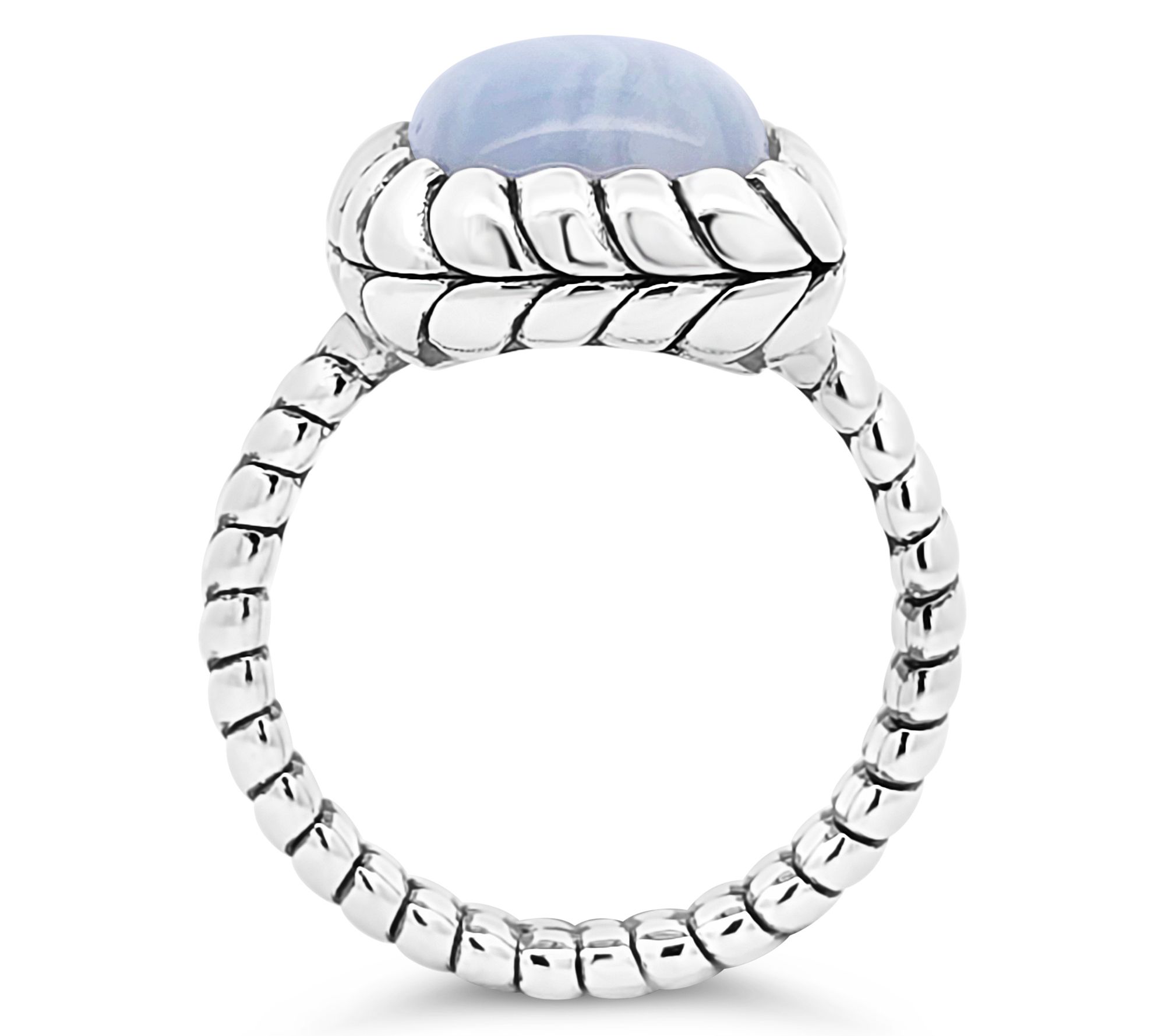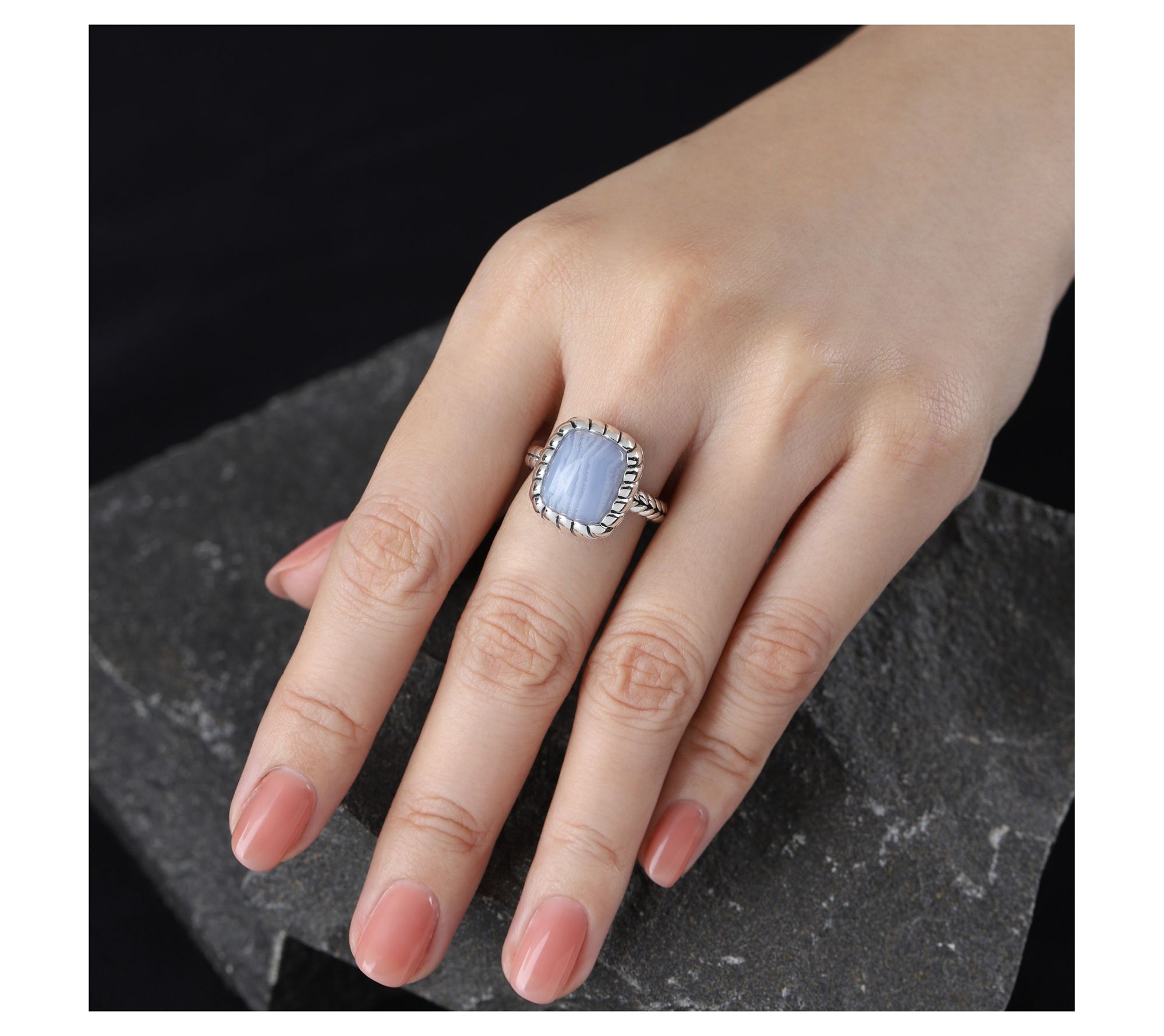 Soft blue hues have a calming presence that pairs beautifully with anything from jeans and a tee to a favorite sundress. Polished sterling silver sets a tranquil scene for blue lace agate, letting you express an easygoing vibe wherever your day takes you. Style it solo for subtle color or mix it in with your favorite stackers for a fresh, layered look. From Tiffany Kay Studio.