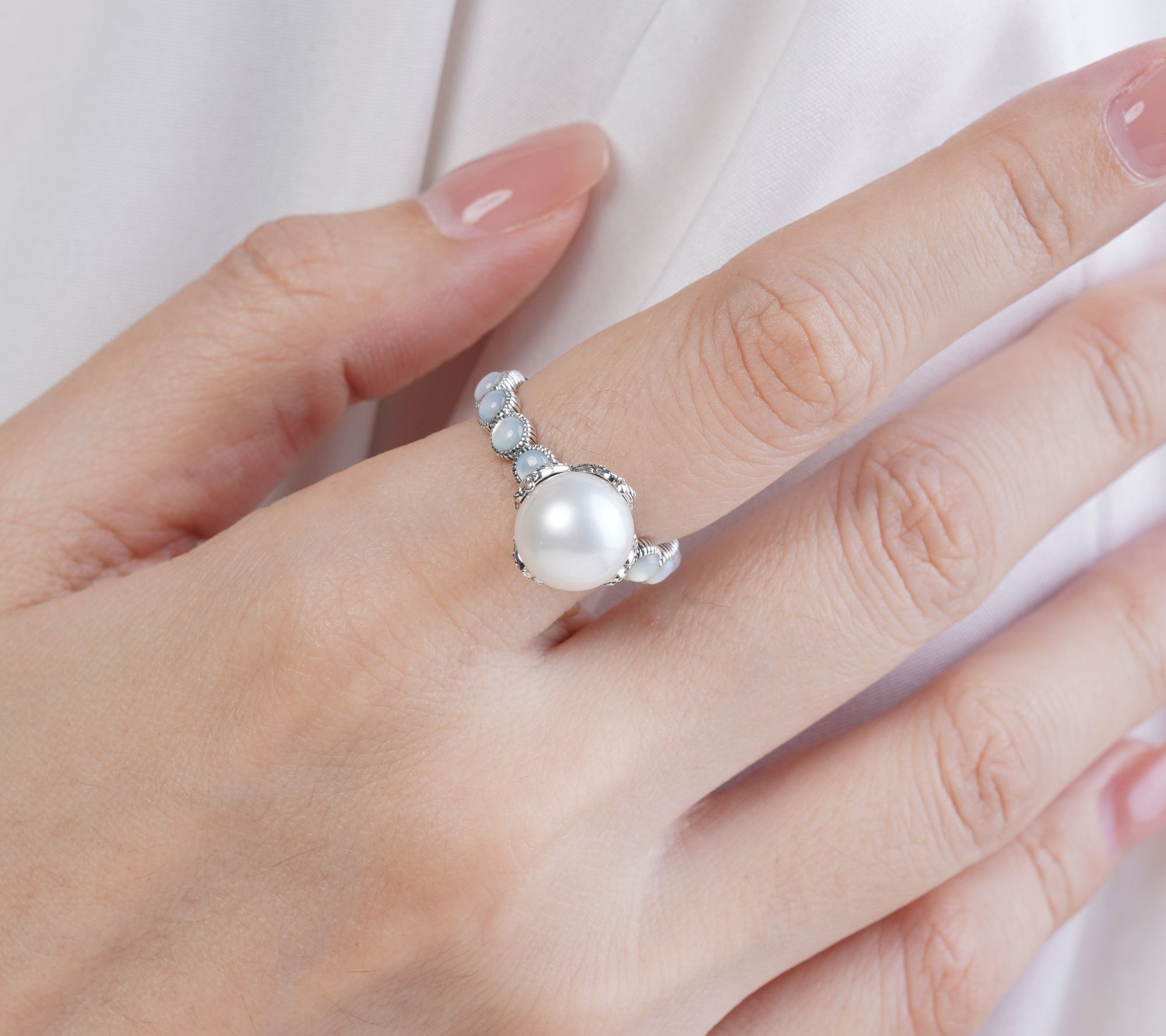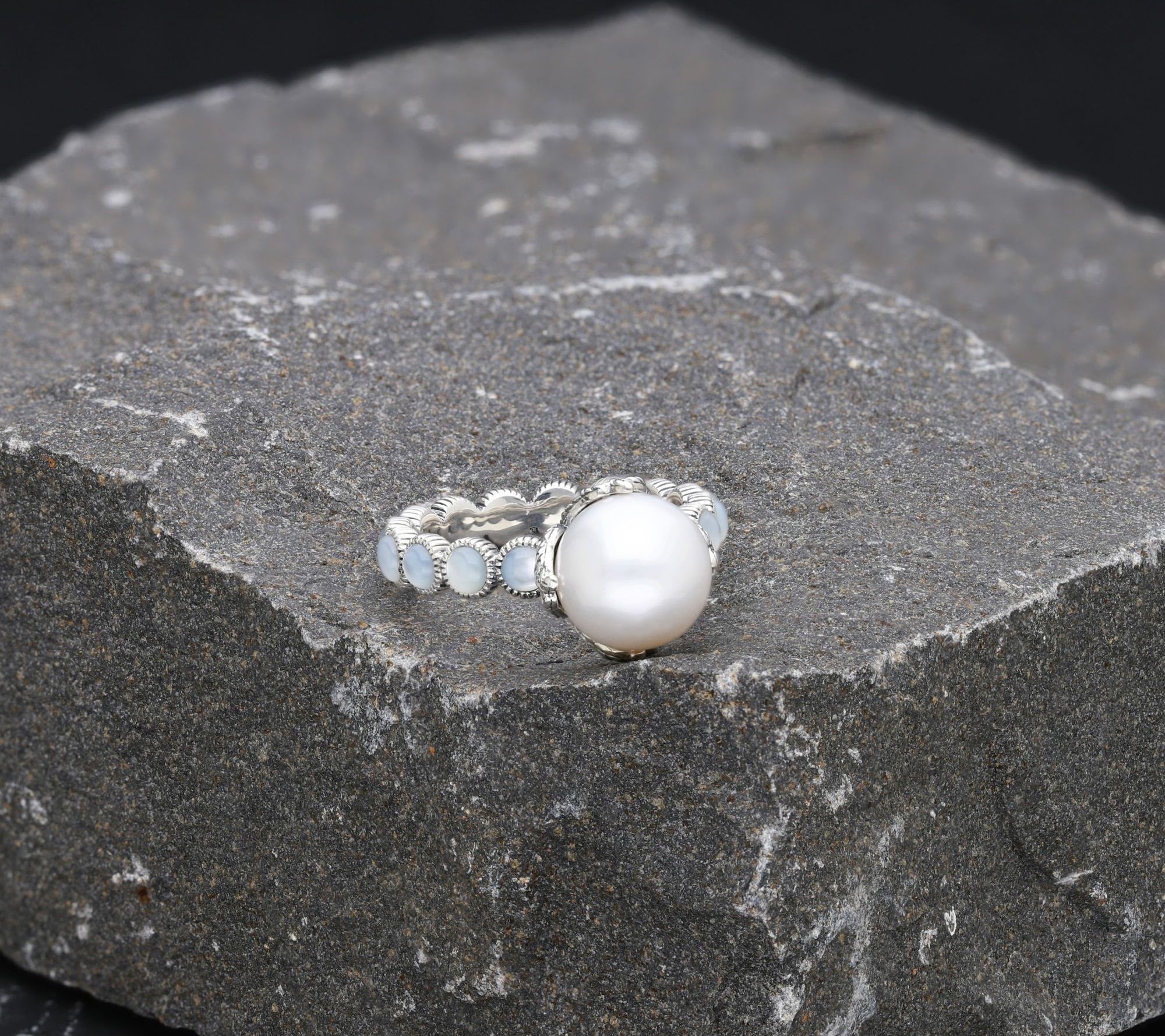 • Single cultured freshwater pearl center; mother of pearl stones set in eternity band; textured sterling silver details