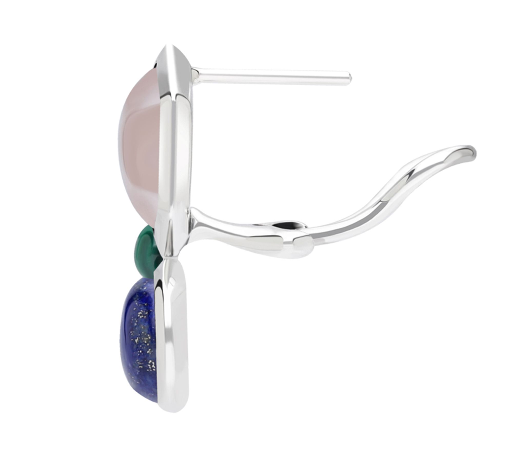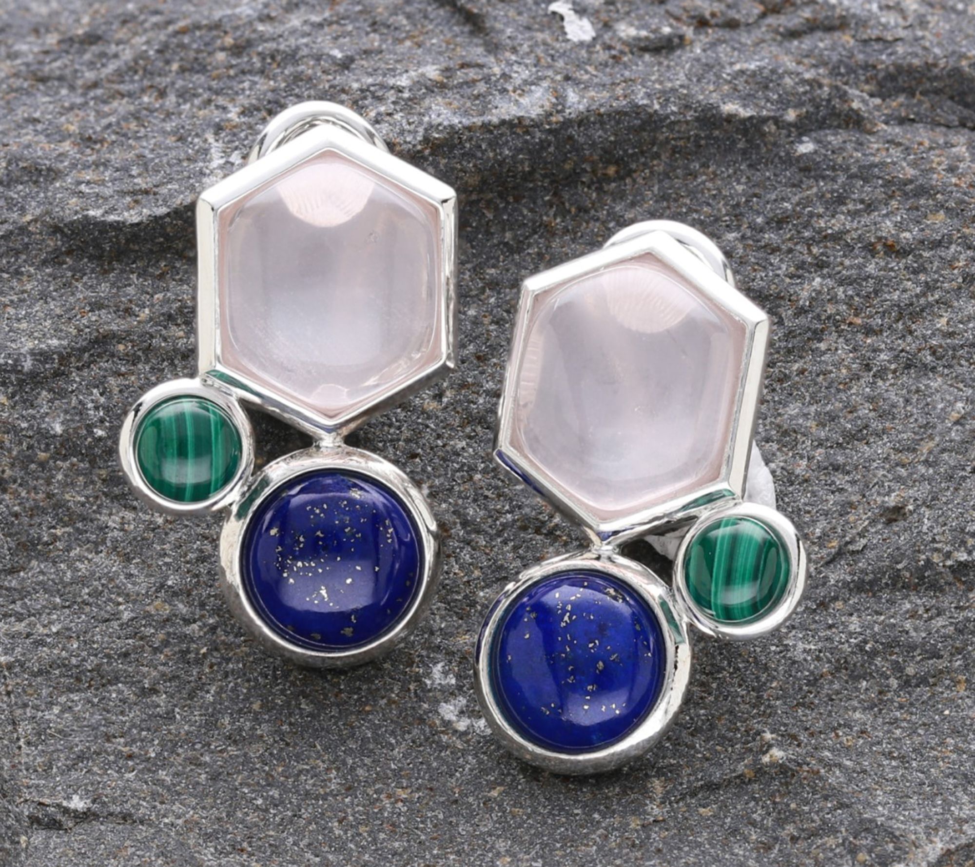 • Hexagon rose quartz cabochon; circles of malachite and lapis cabochons