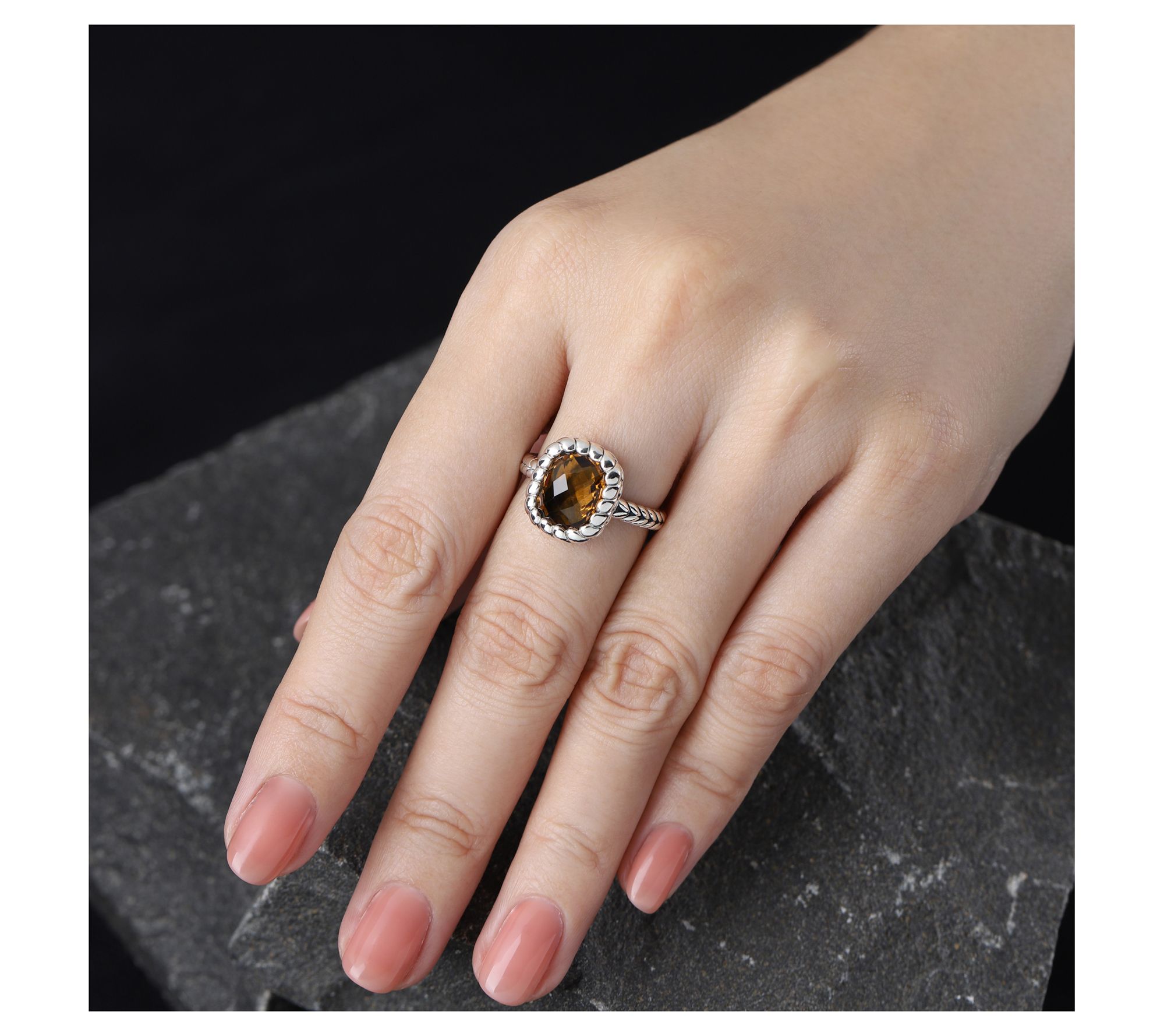 Making a statement is easy when you slip on this sterling silver ring showcasing the warm glow of ginger quartz. Its vibrant, earthy hue brings an unexpected twist to everything from casual coffee dates to celebrating special milestones, adding color and confidence to every gesture. From Tiffany Kay Studio.