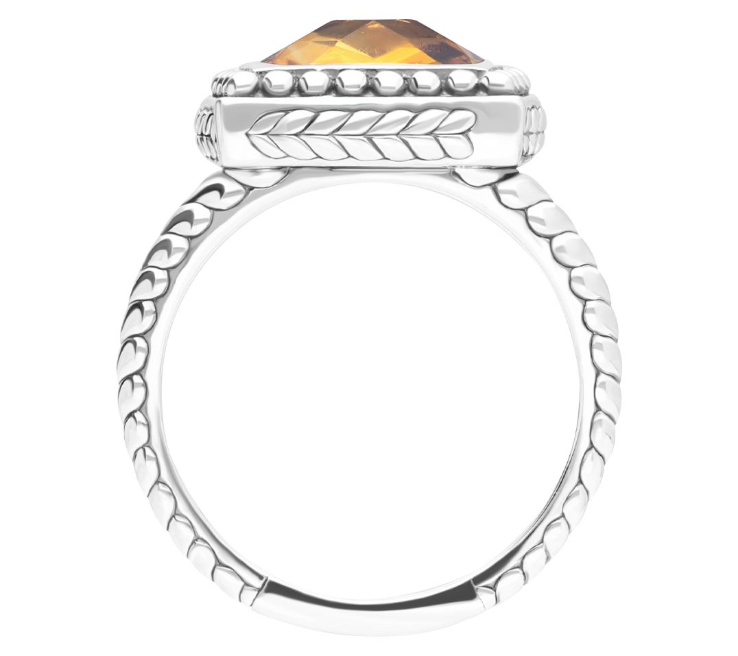 Bezel-set citrine gemstone surrounded by beaded detail; herringbone pattern on the shank