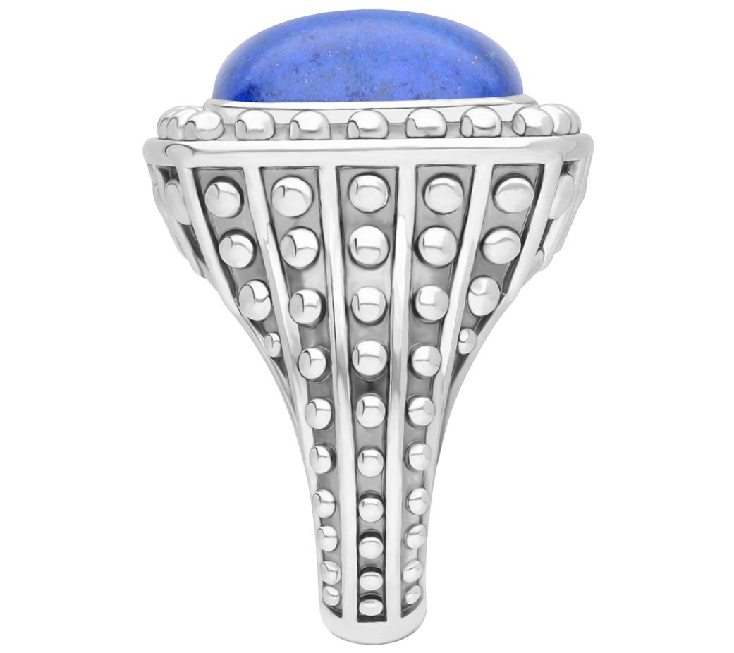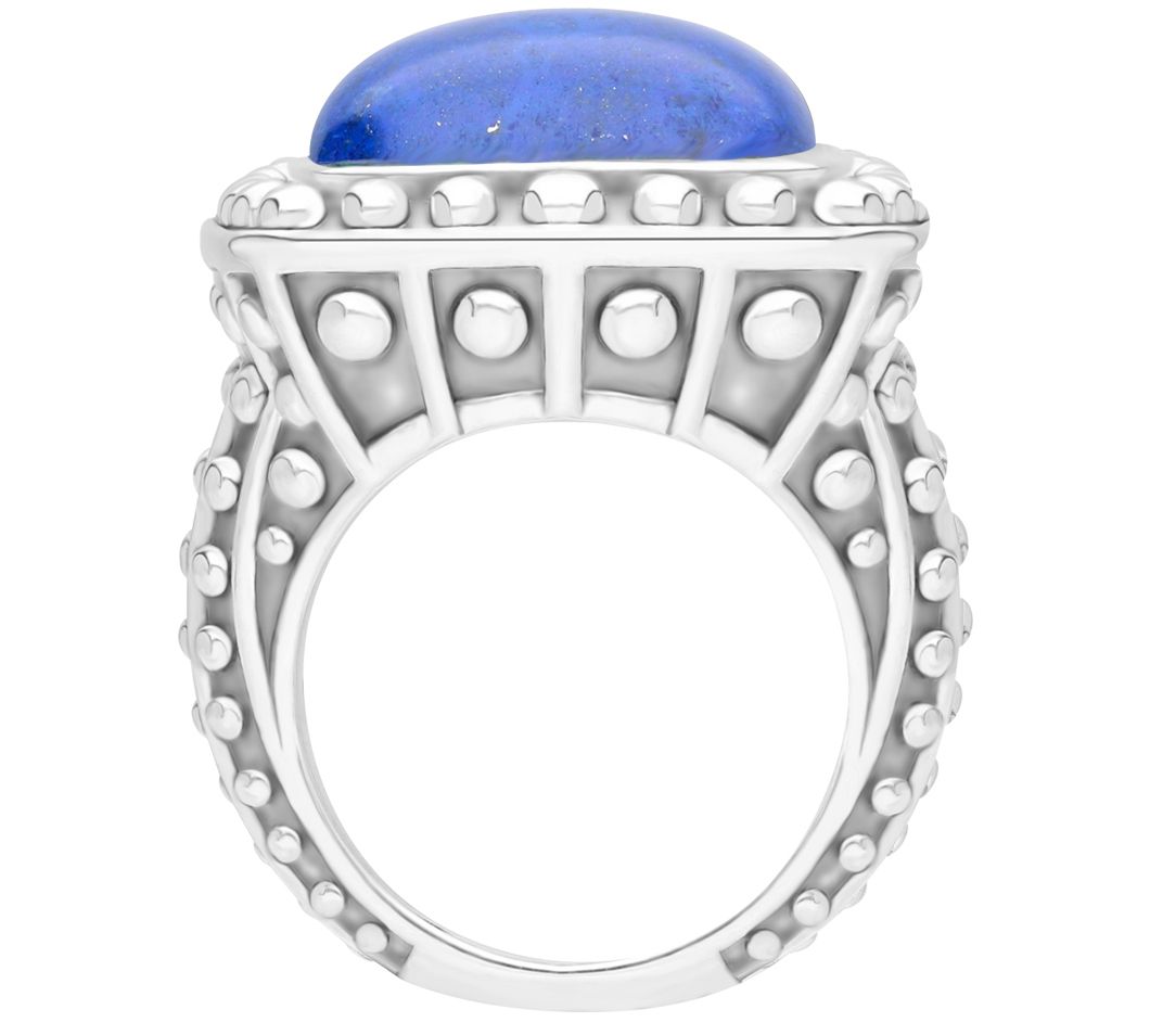 - Bezel-set cushion-cut lapis lazuli gemstone with beaded frame; bead details down shank and sides