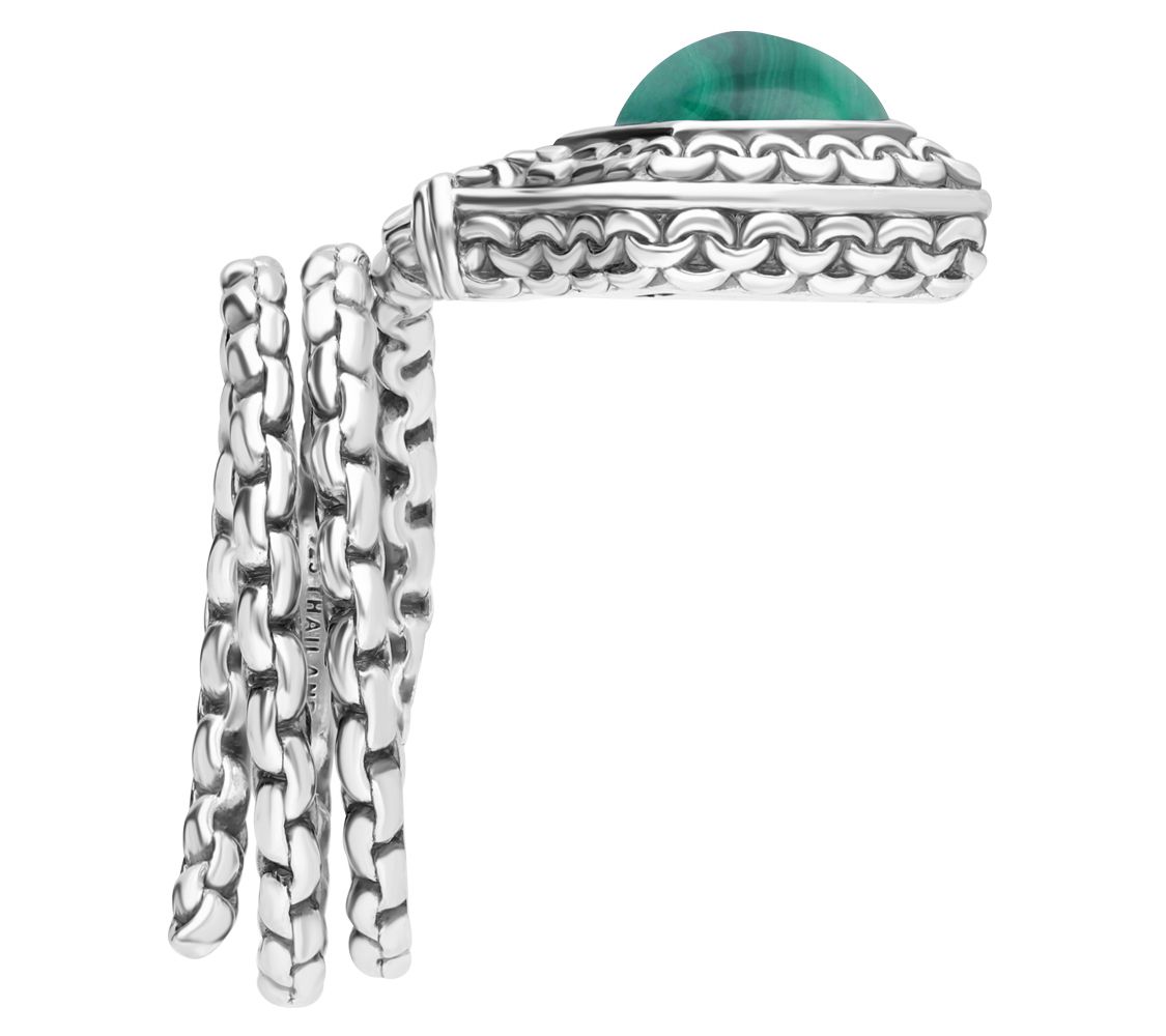 Purl-knit textured design inlaid with shield-cut malachite cabochon; polished frame