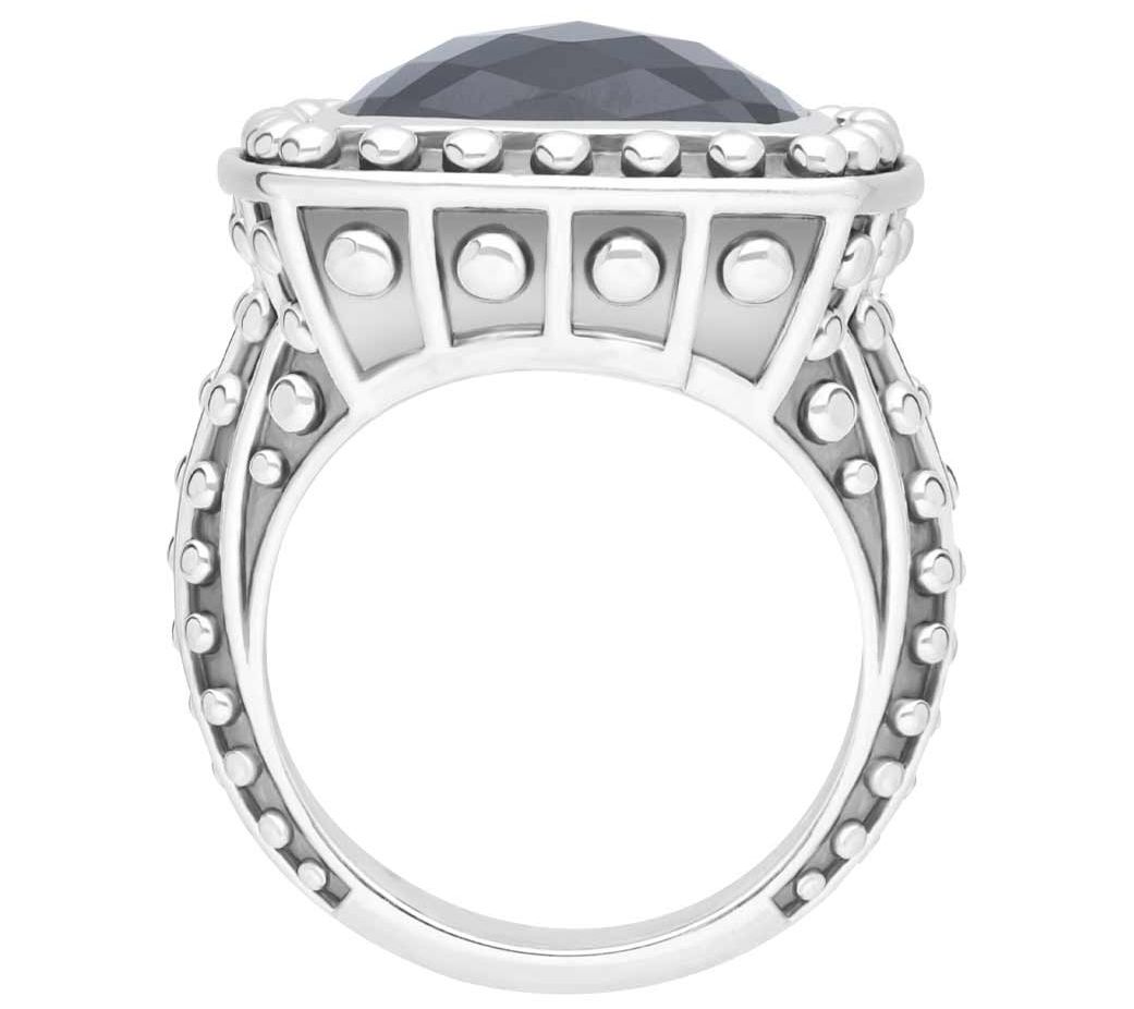 - Bezel-set cushion-cut faceted onyx gemstone with beaded frame; bead details down shank and sides