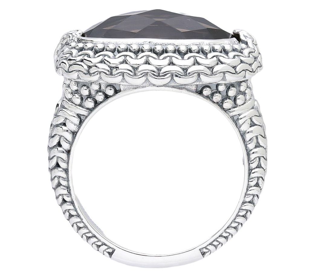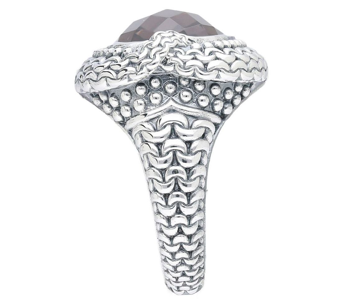 - Oval pineapple-cut faceted smoky quartz stone; signature purl knit texture