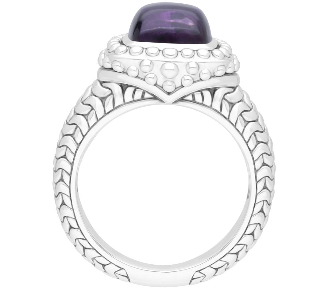 Cushion-cut, bezel-set amethyst cabochon surrounded by a beaded frame; purl-knit design on shank