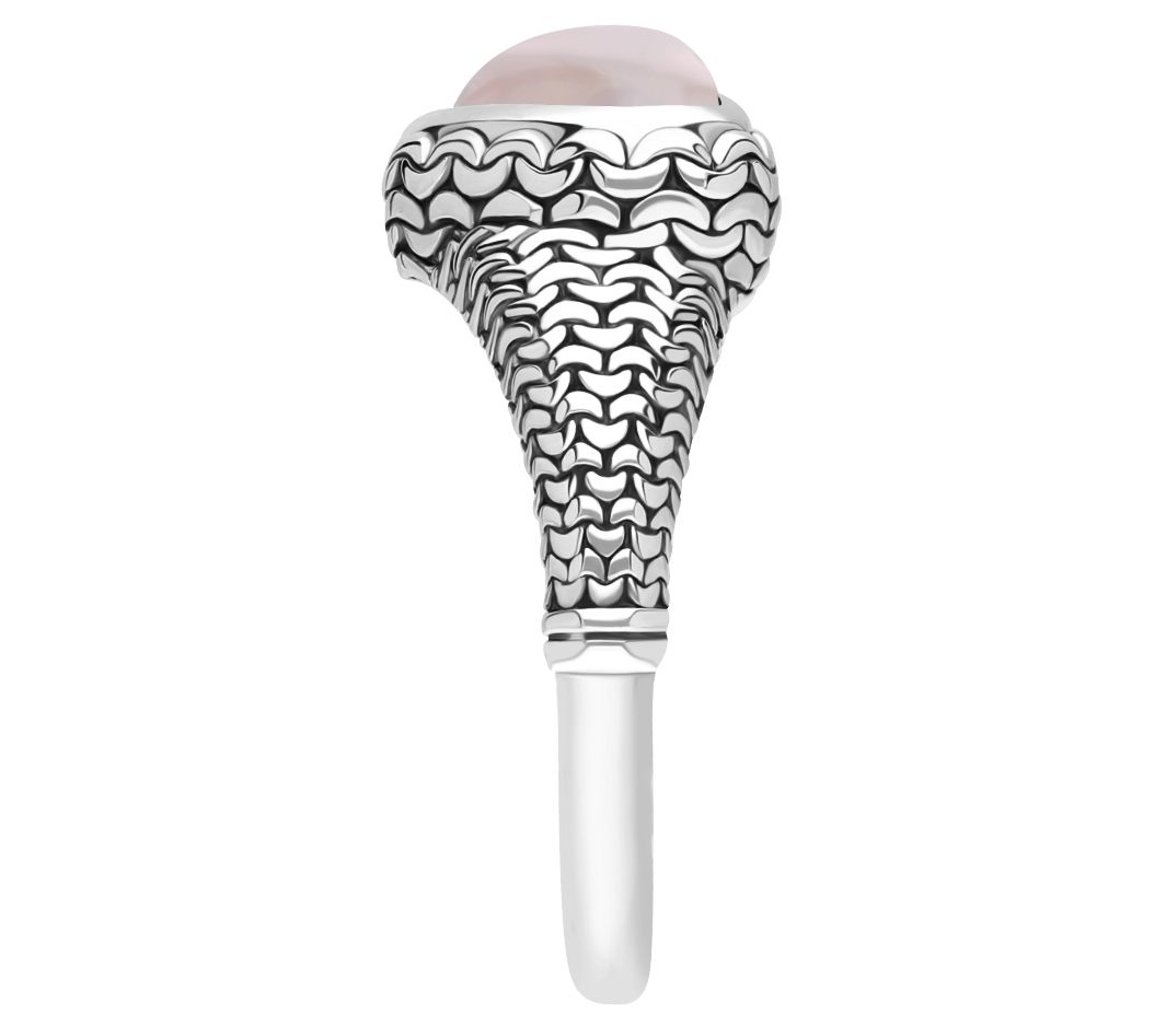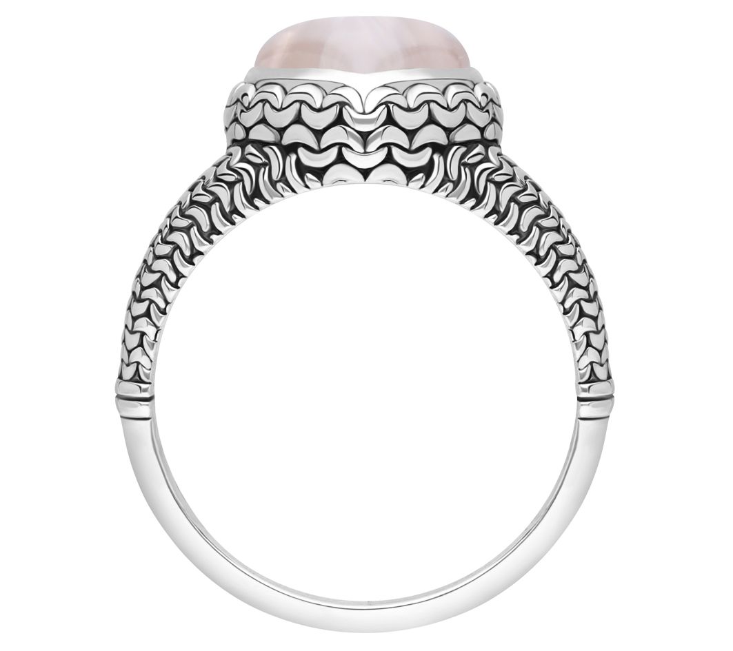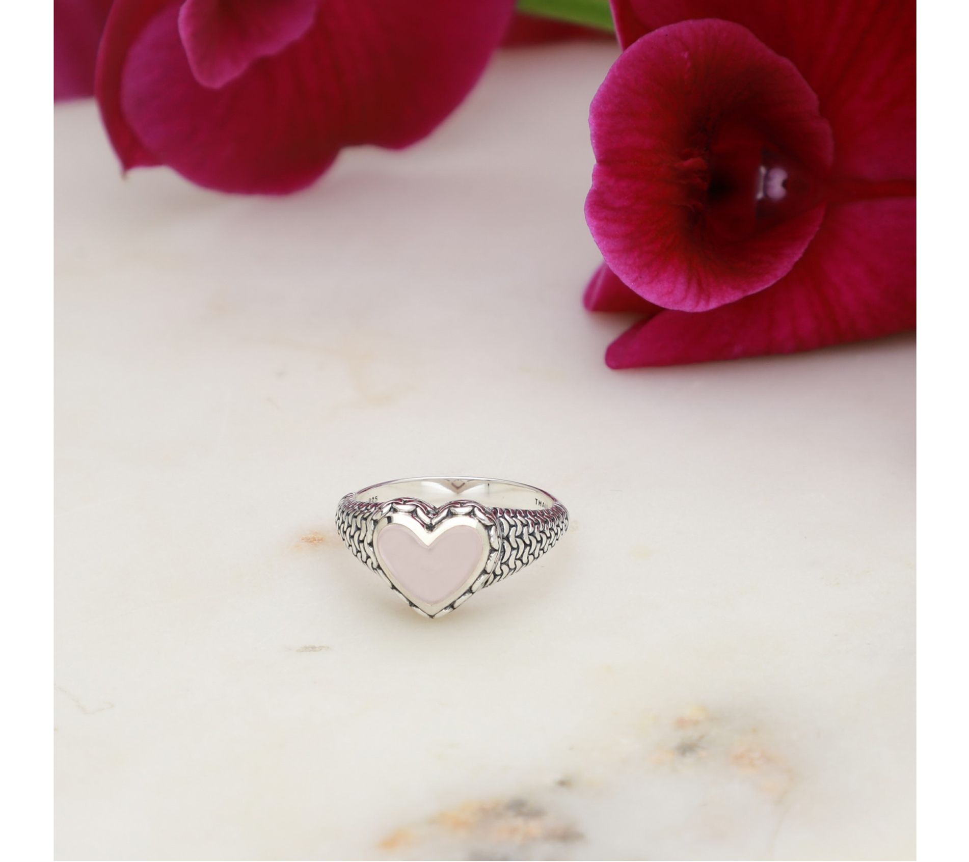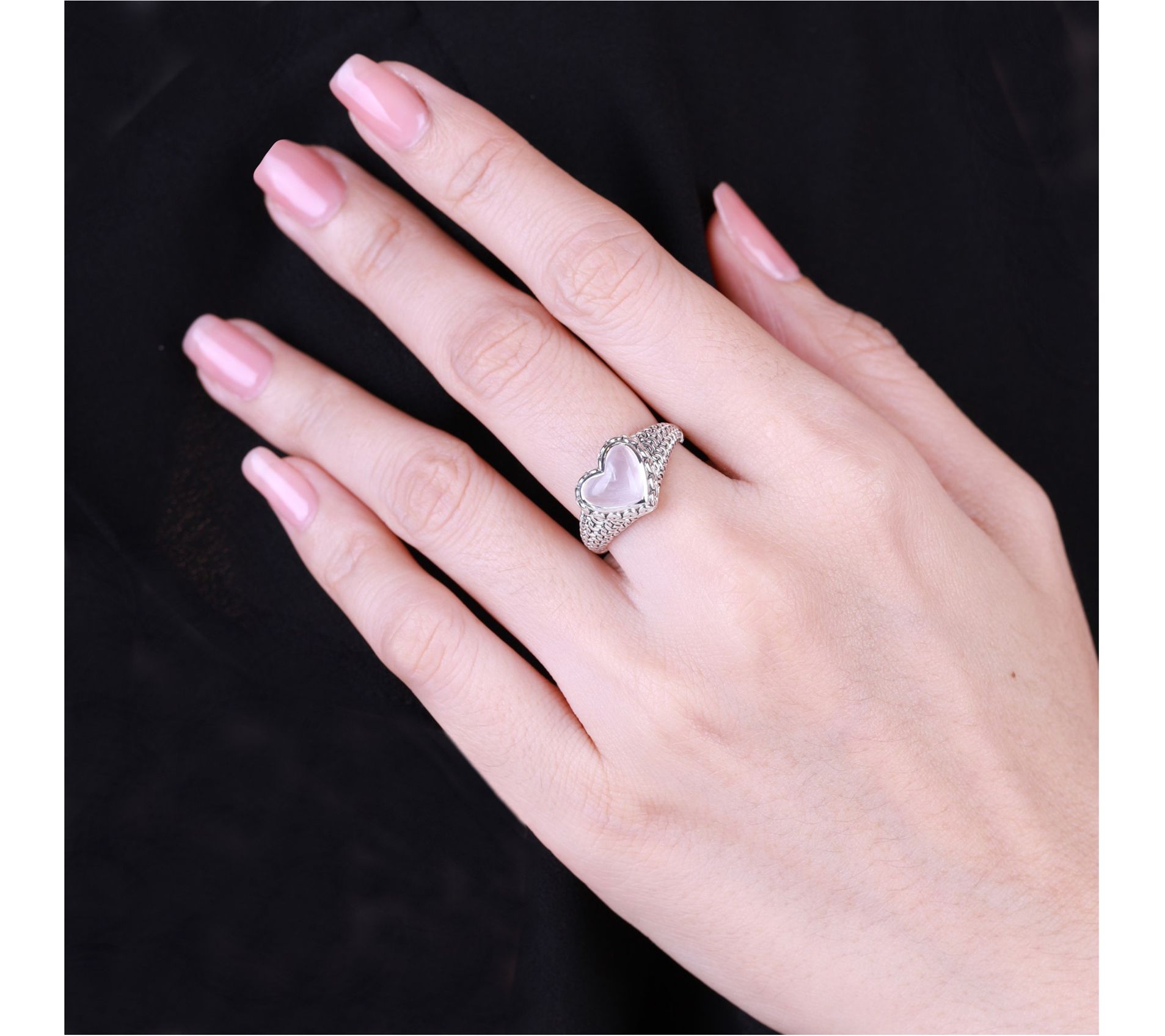 Heart-cut bezel-set rose quartz center; purl knit textured band