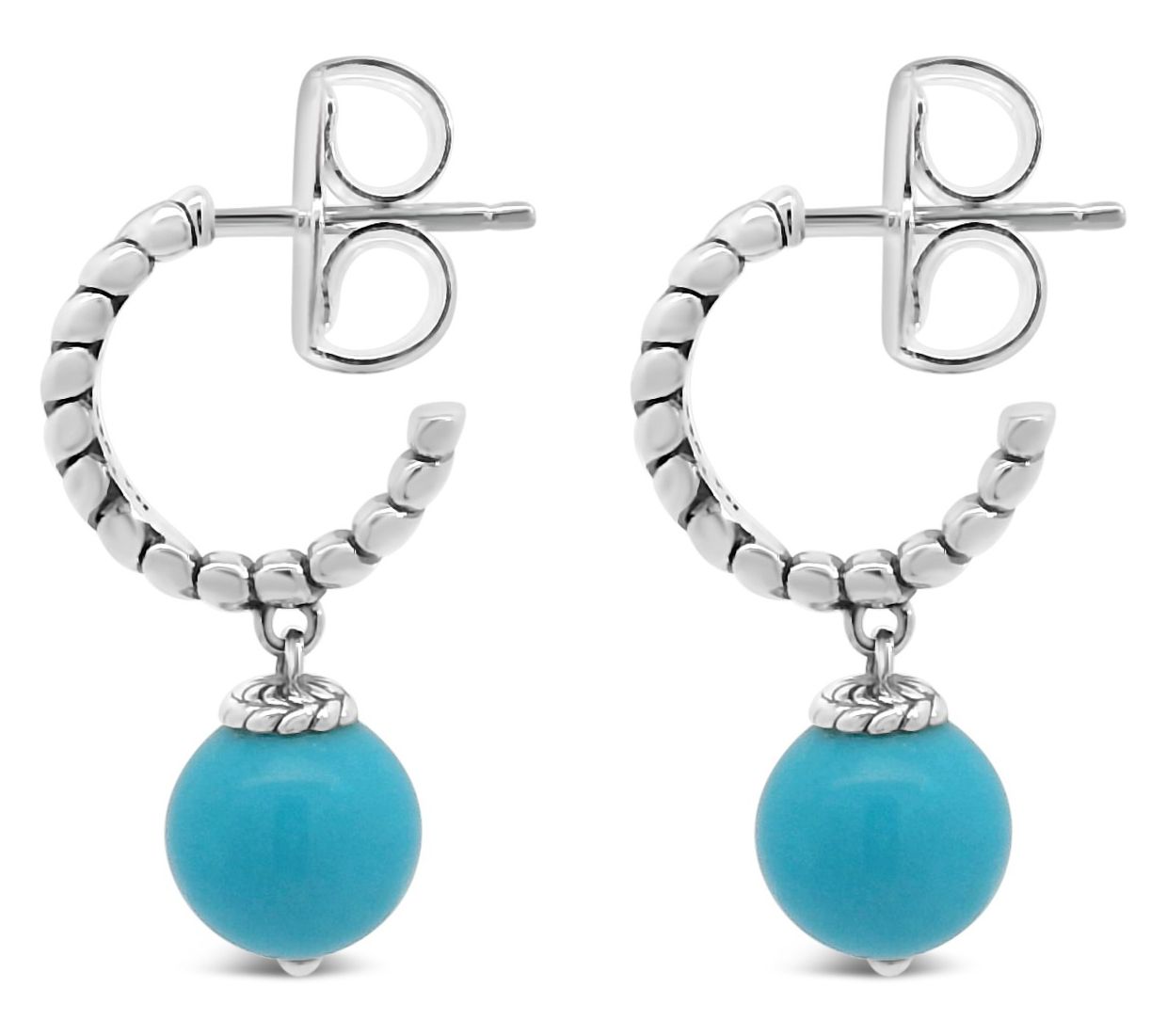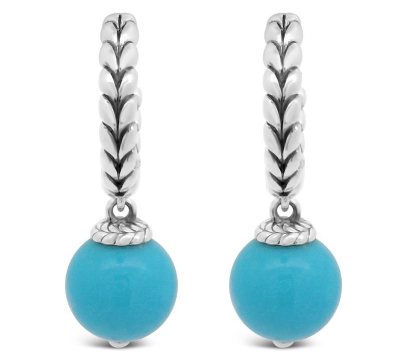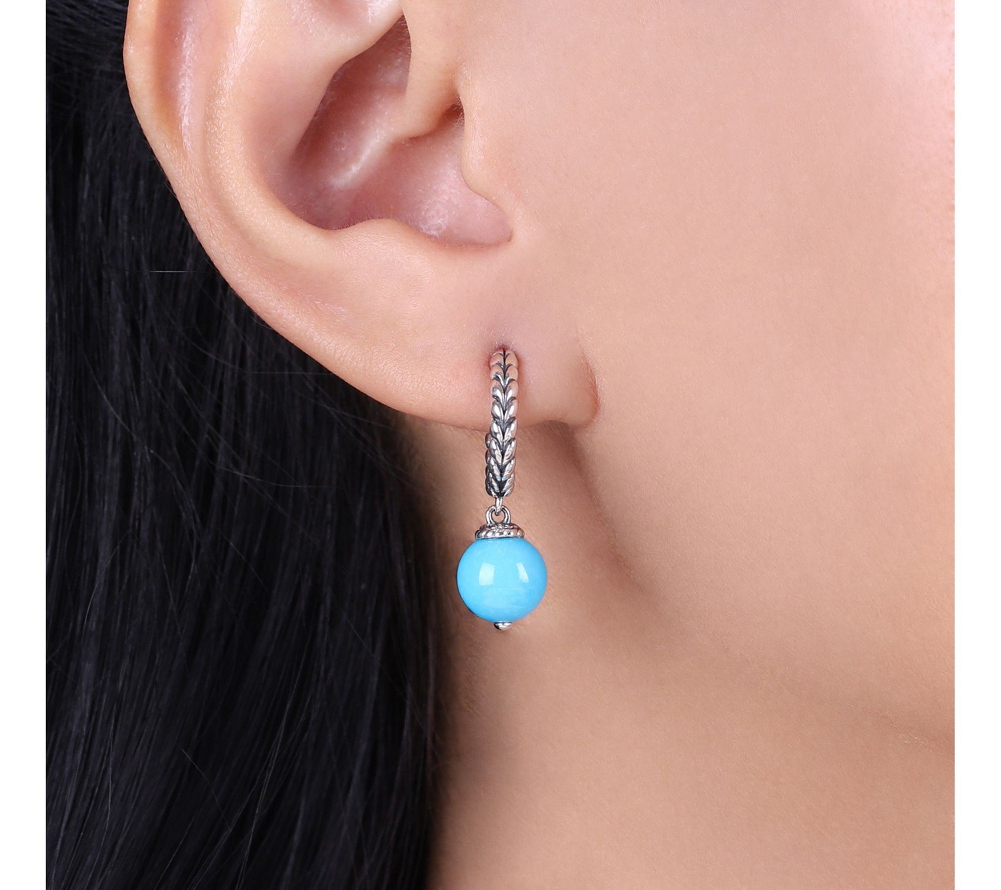 Add a touch of elegance to your everyday look with these stunning turquoise hoop earrings. The herringbone textured hoop is accentuated with a beautiful turquoise bead drop, offering a unique flair that's perfect for both casual outings and special occasions. From Tiffany Kay Studio.