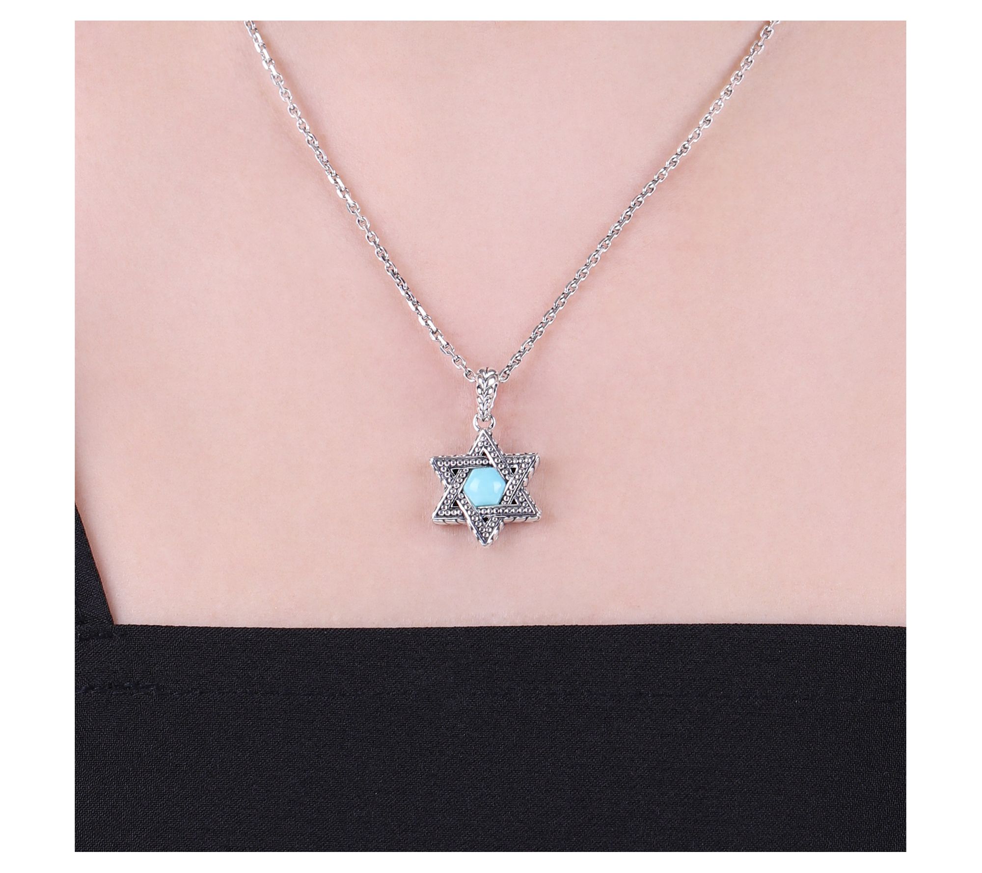 Oval link chain; turquoise gemstone set in beaded and herringbone-textured Star of David
