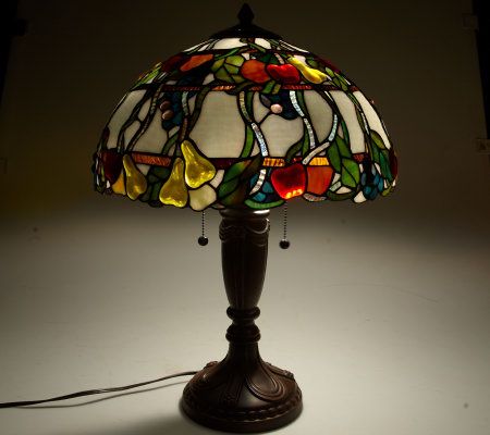 A rainbow of colors makes this exquisite Tiffany-style lamp a glowing addition to your home decor. Against a background of iridescent, white, clear ripple glass, fruit and floral designs emerge in a vibrant blend of colorful hues. Three amber ripple glass bands adorn the shade that rests atop a bronzed metal base with a decorative column on a round foot.