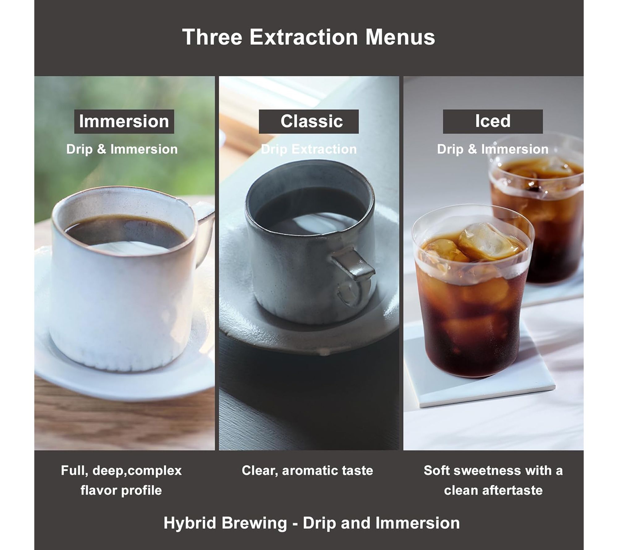 • Features three push-button brewing settings: Immersion Hot, Classic Hot, and Iced Coffee
