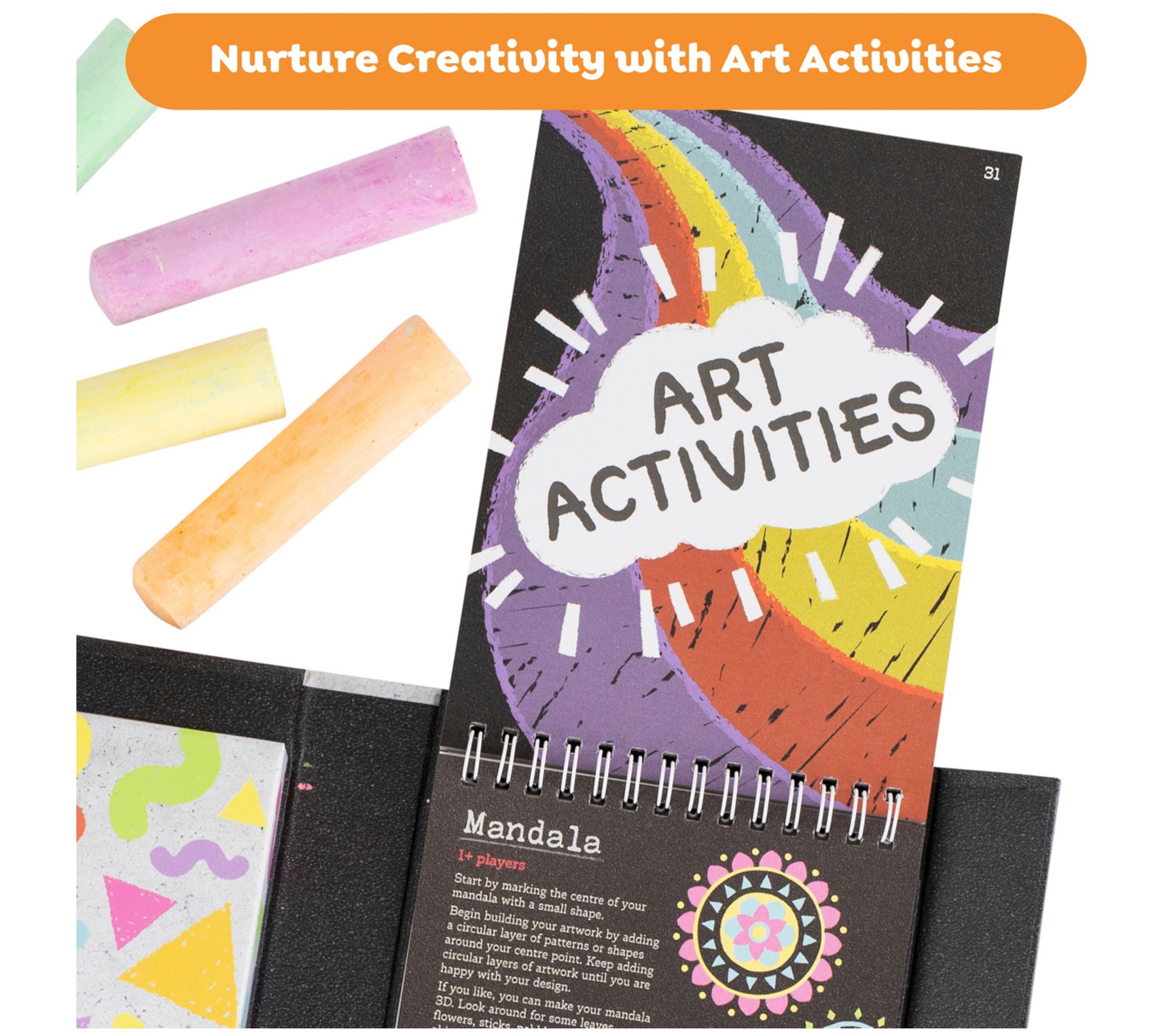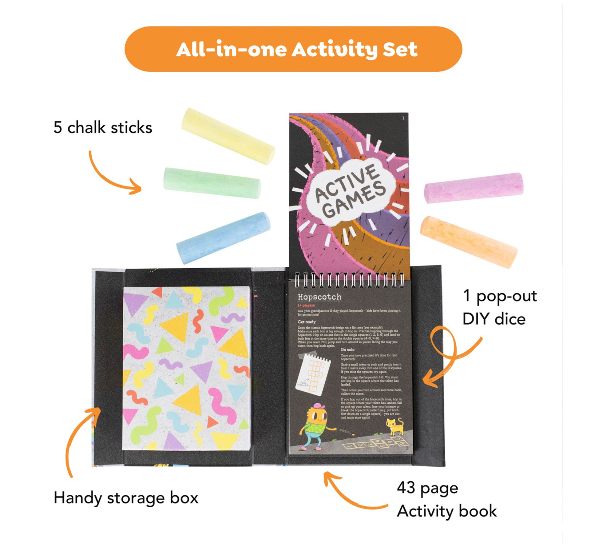 • Includes 43 page guided activity book, five chunky chalks, pop-out DIY dice, pencil, and compact storage case
