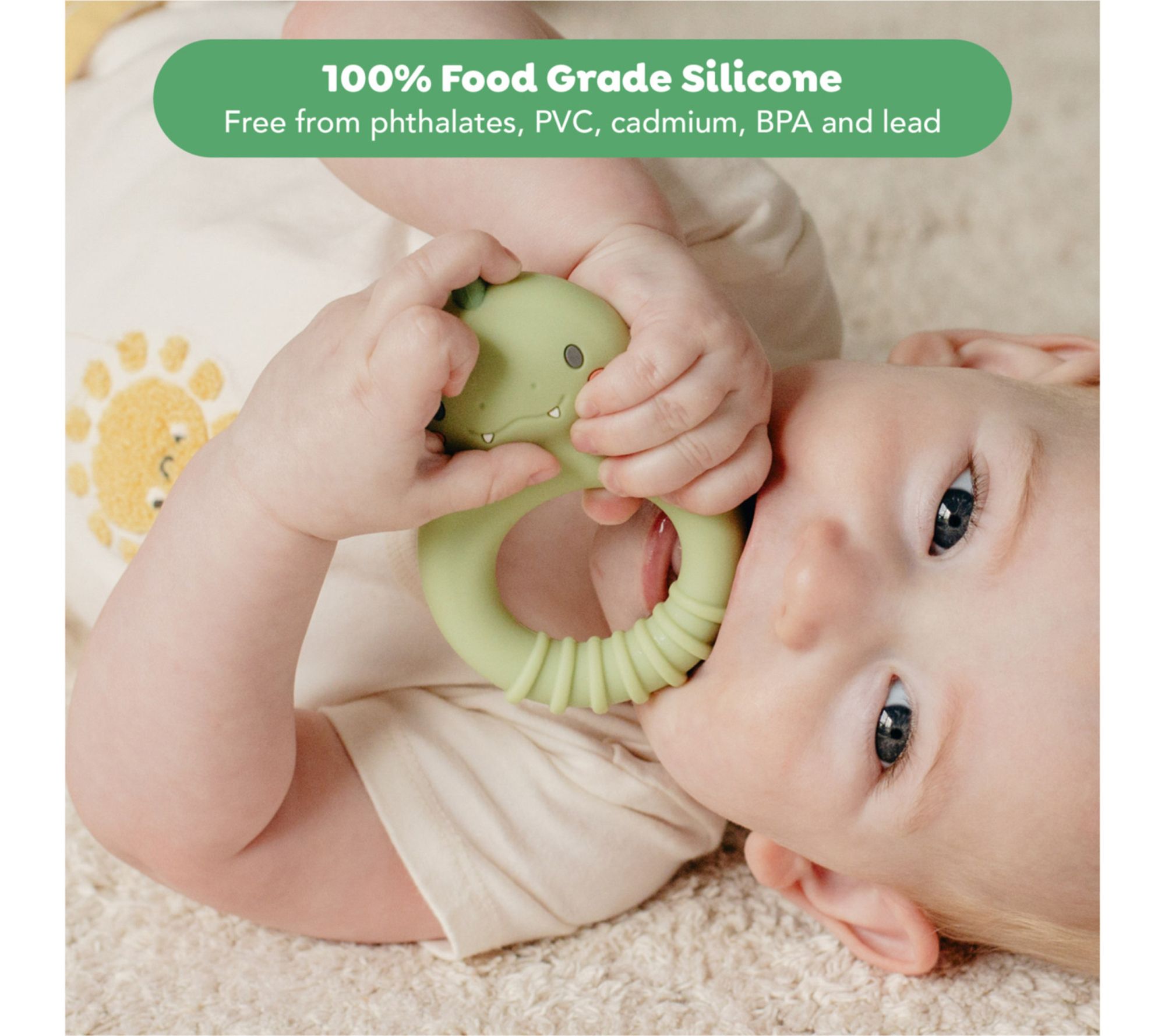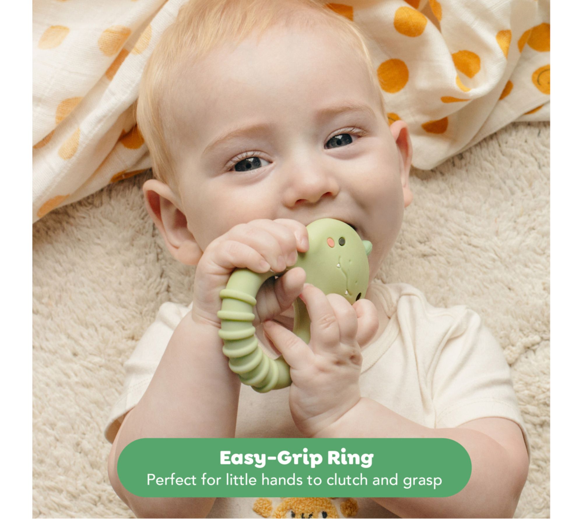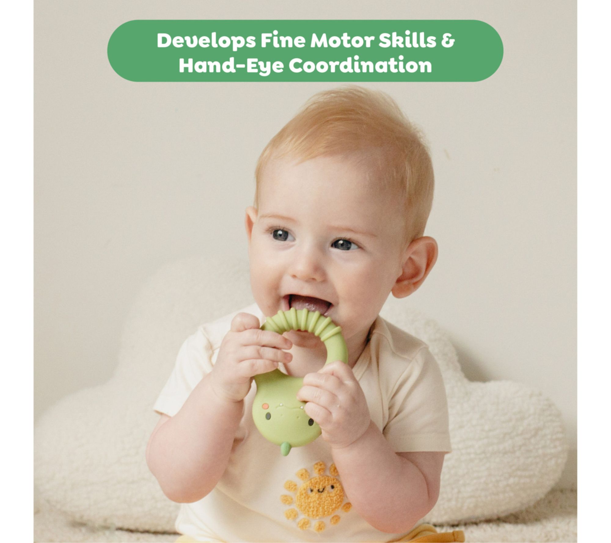 Help your little one find comfort and relief during teething with this adorable dinosaur silicone teether. Designed with soothing textures and a lightweight, easy-grip ring, it encourages sensory exploration and helps develop early motor skills while offering gentle support through every stage of teething. From Tiger Tribe.