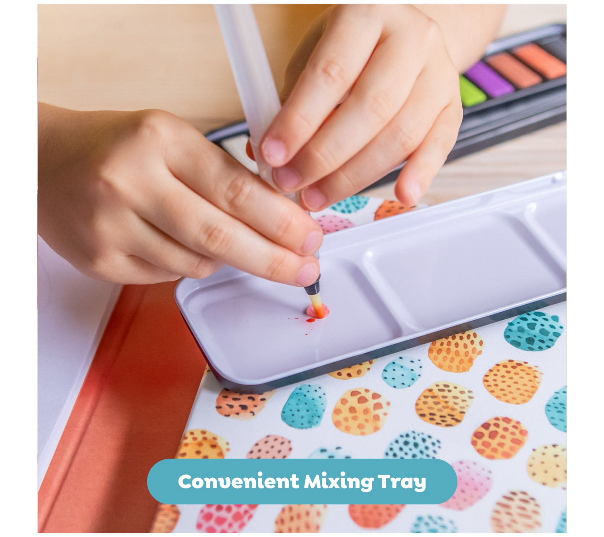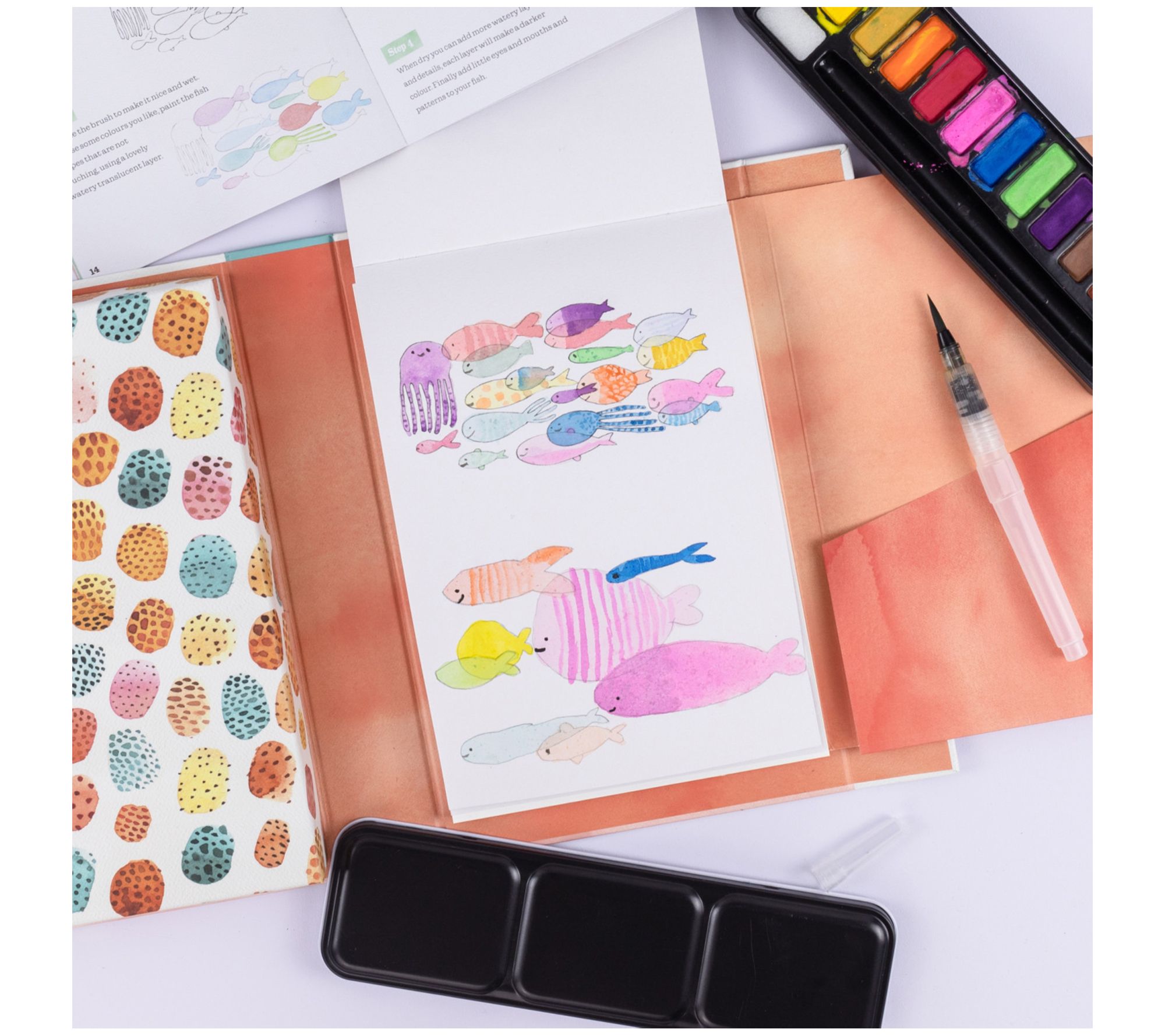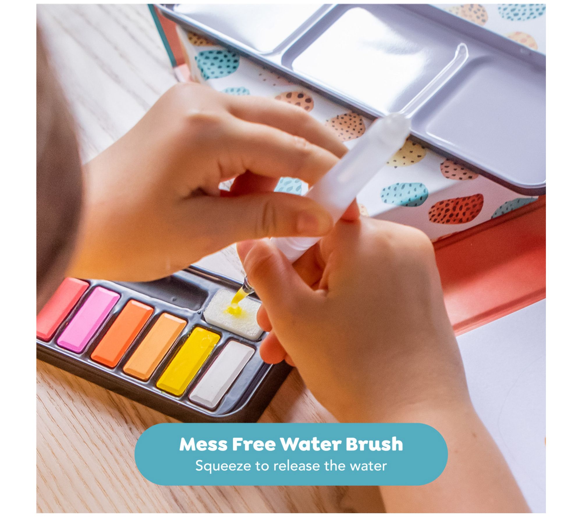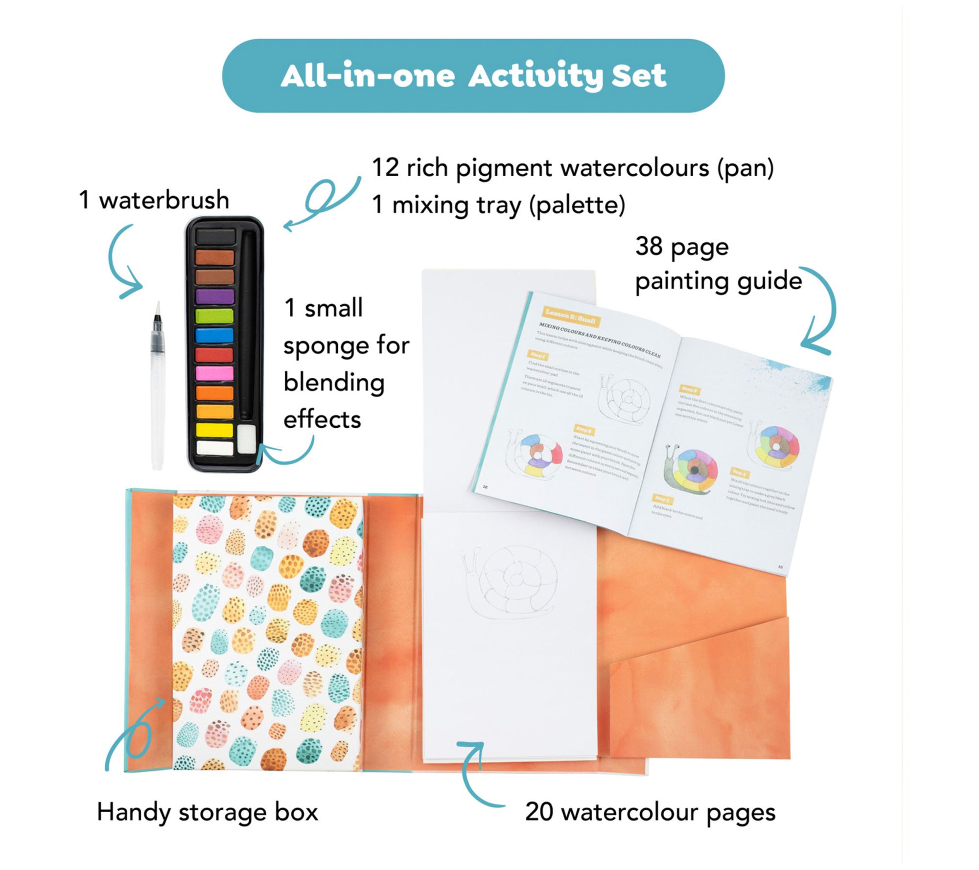 • Includes 38-page instruction booklet, 20-page booklet watercolor paper, mess-free waterbrush, 12 rich pigment watercolors, sponge for blending effects, and palette mixing tray