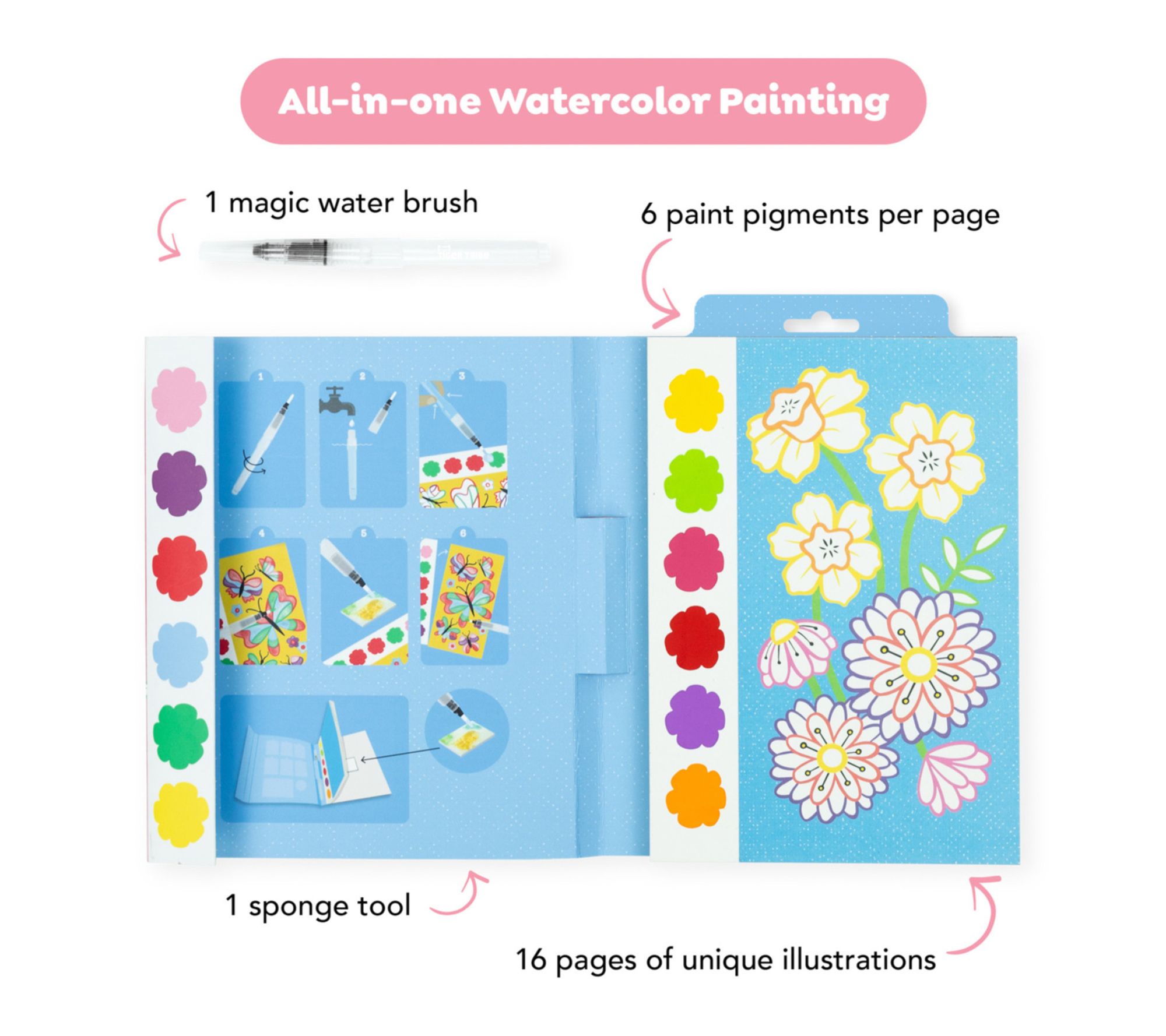 • Includes 16 pages each with unique illustration to paint, six paint pigments per page, one refillable mess free water brush, one sponge tool, and one carry pack with sturdy magnetic seal